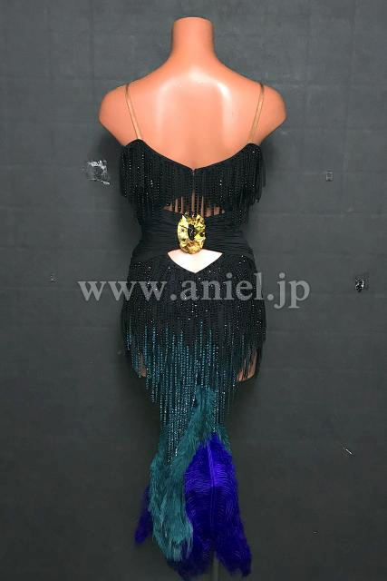 緑と青の羽根のスカートはセンターロングデザインで脚を長く見せてくれます。