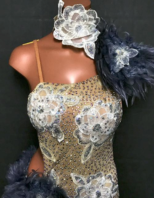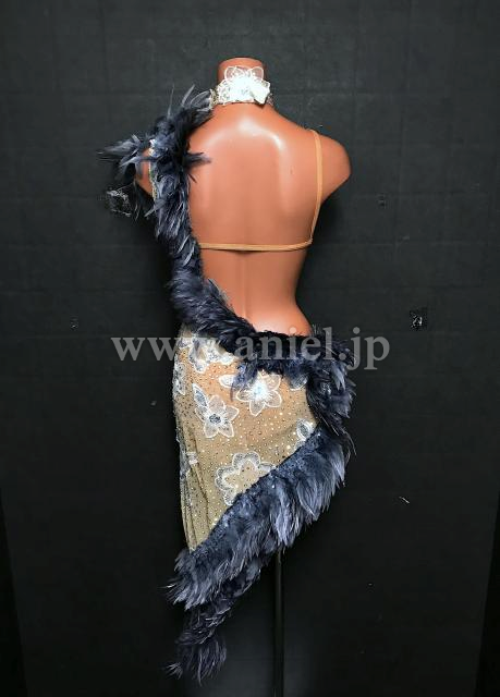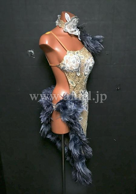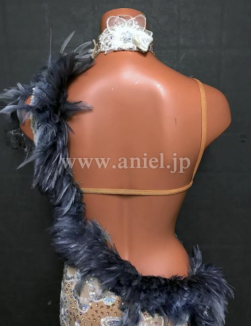 ベージュのボディにグレーの羽根がシックでおしゃれなドレスです。