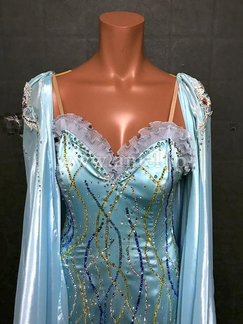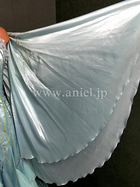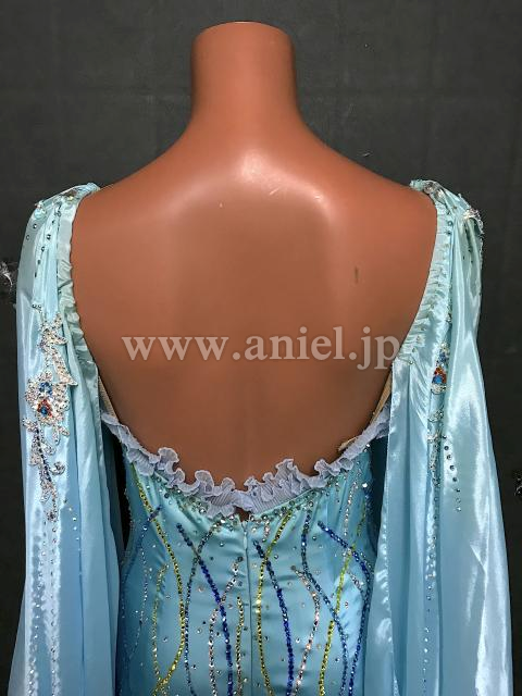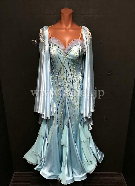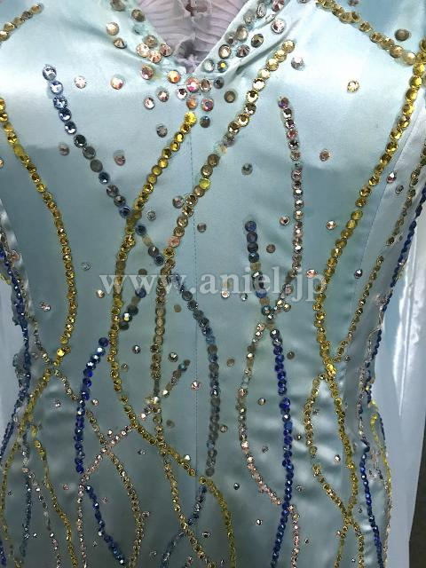 水色の地にストーンが流れるように柄を描き、涼やかでスッキリとした印象のドレスです。