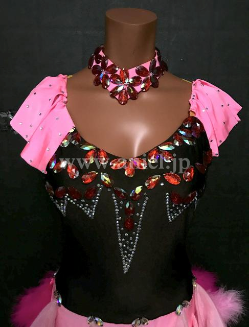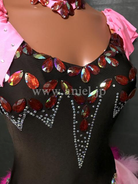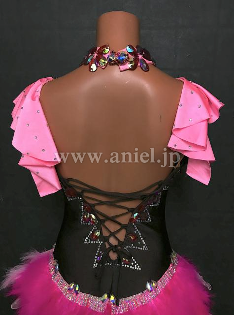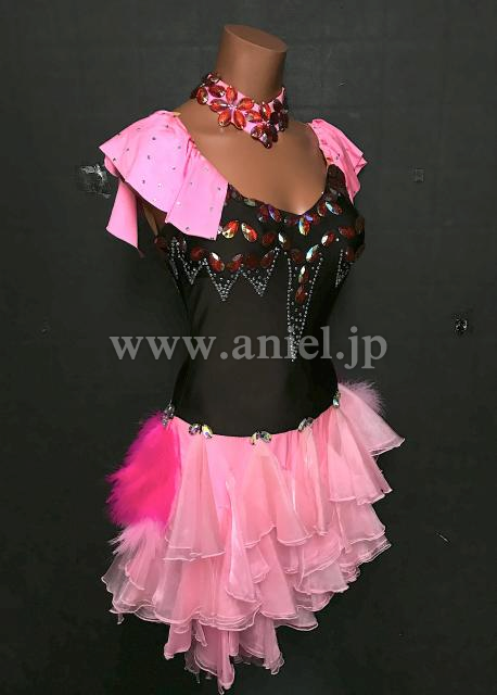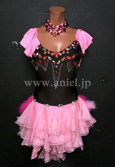 ブラウンのボディにピンクフリルが可愛らしいミニ丈ドレスです。
