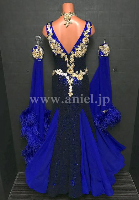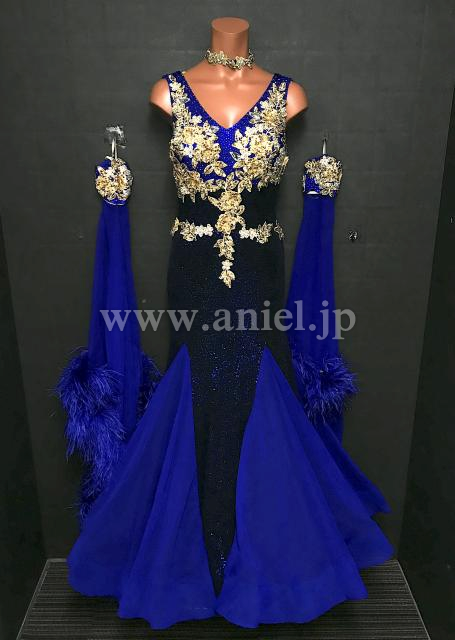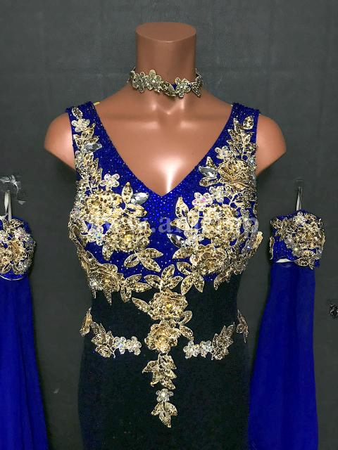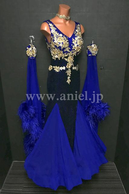深い青にゴールドのモチーフが華やかに映えるドレスです。