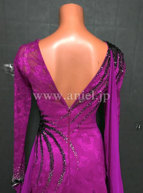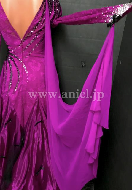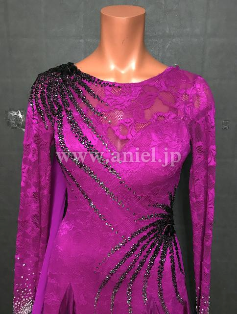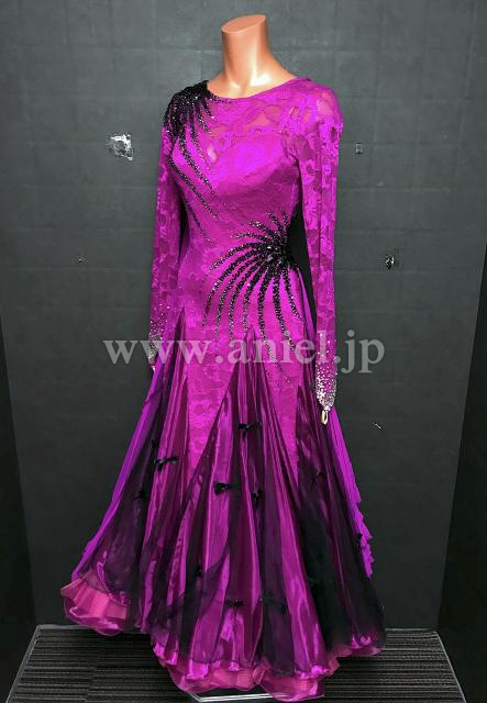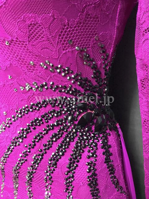 濃いフクーシャピンクに黒のストーンのラインが豪華なドレスです。