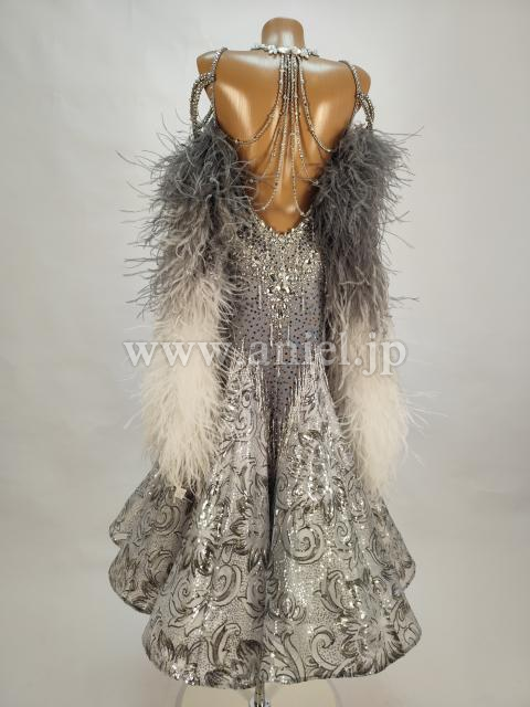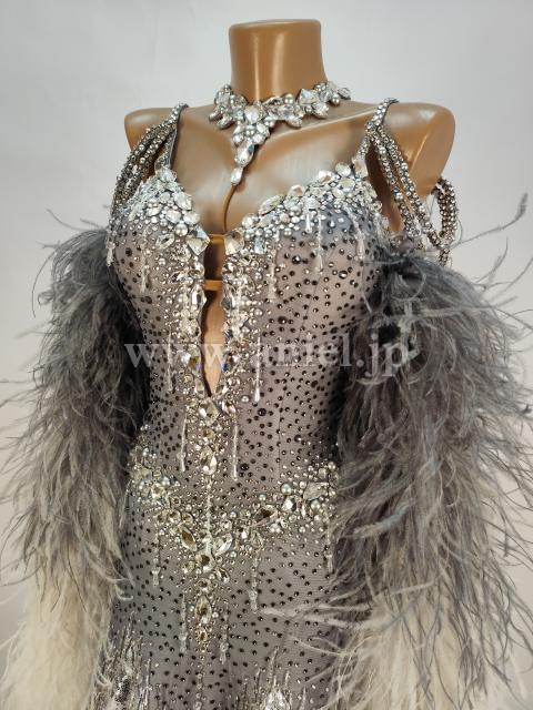 グレーシルバーのボディにクリスタル、ヘマタイトの装飾が煌びやかなドレスです。