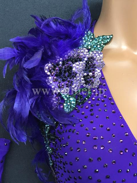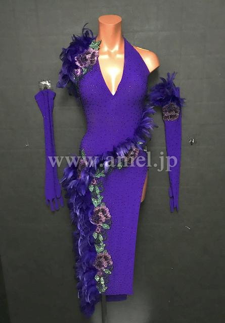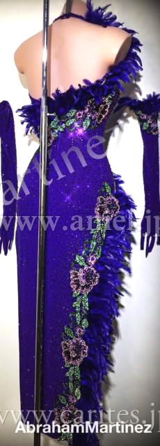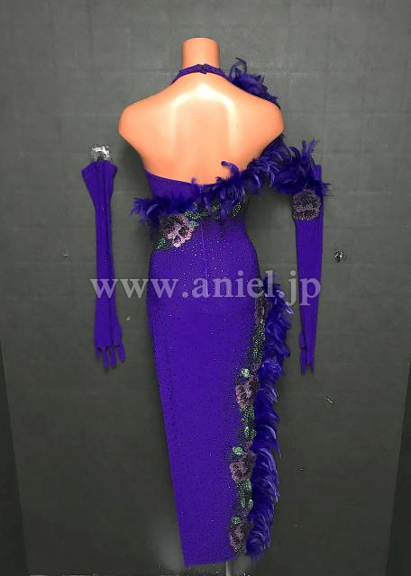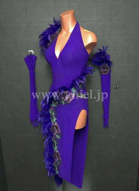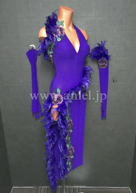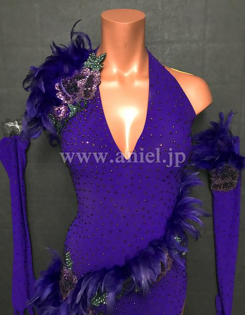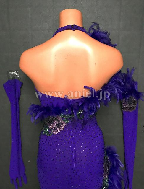 紫の立体的な羽根のラインと花柄のデザインがエレガントなドレスです。