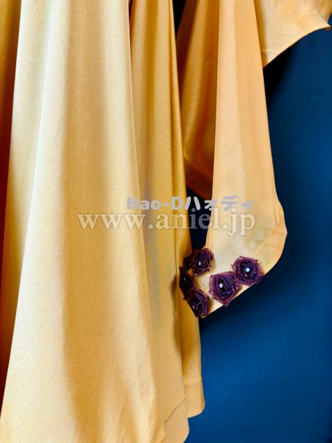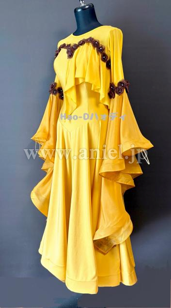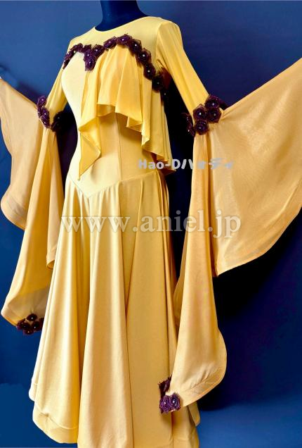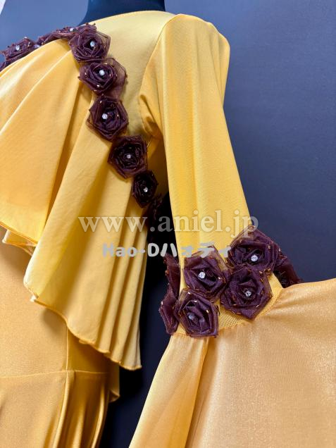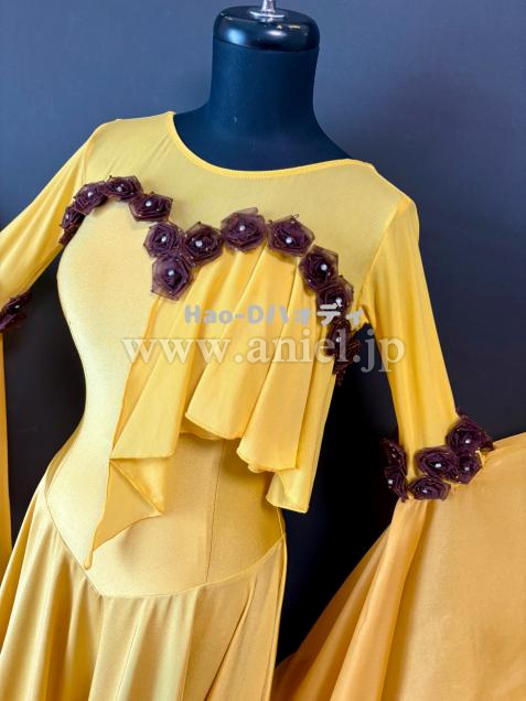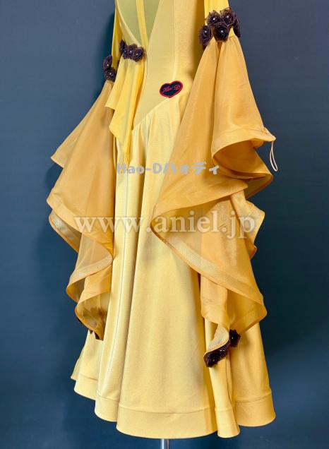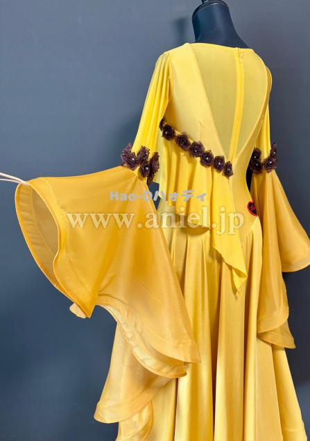 可愛らしいブラウンの小花を飾ったサフランイェローのドレス