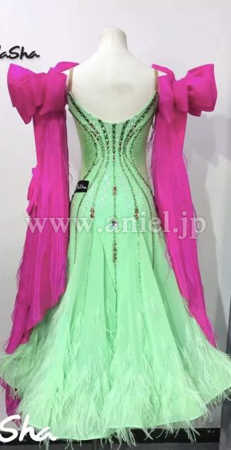 ペパーミントのボディにショッキングピンクの大きなリボンのフロートがインパクトのあるドレスです。