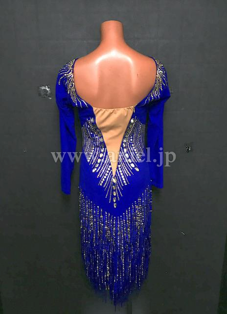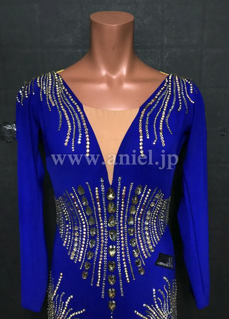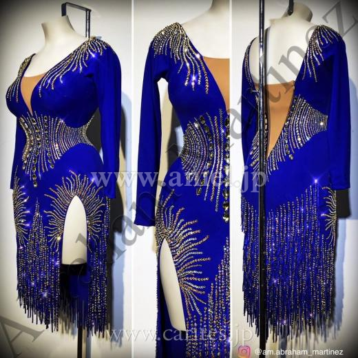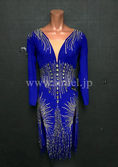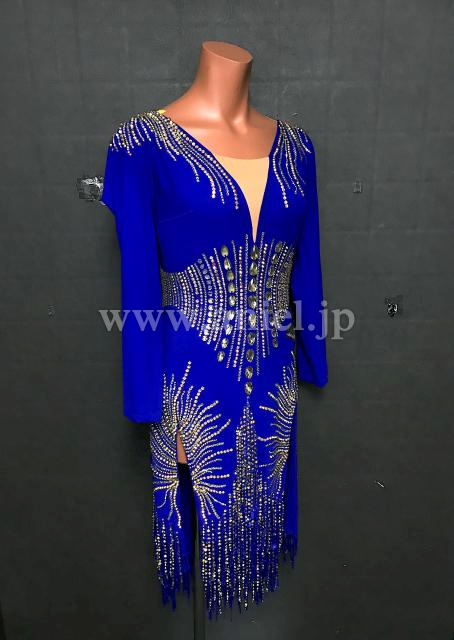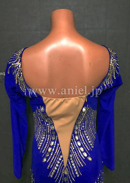 青のボディにイエローゴールドのストーンのラインが豪華なドレスです。
