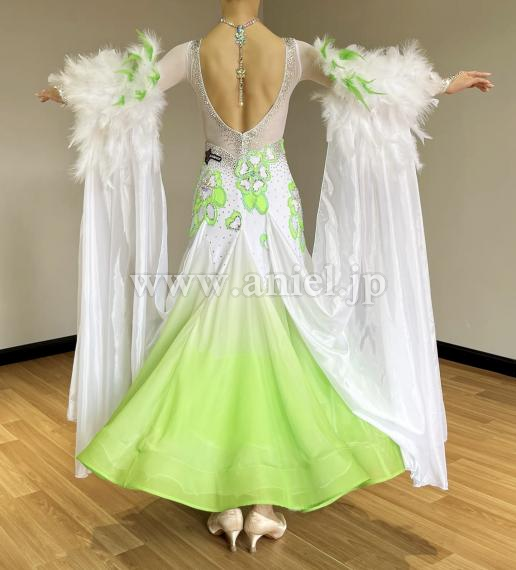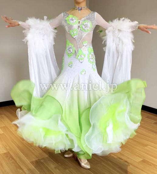羽根と大きなフロート、ボリュームのあるスカートが広がり踊ります。