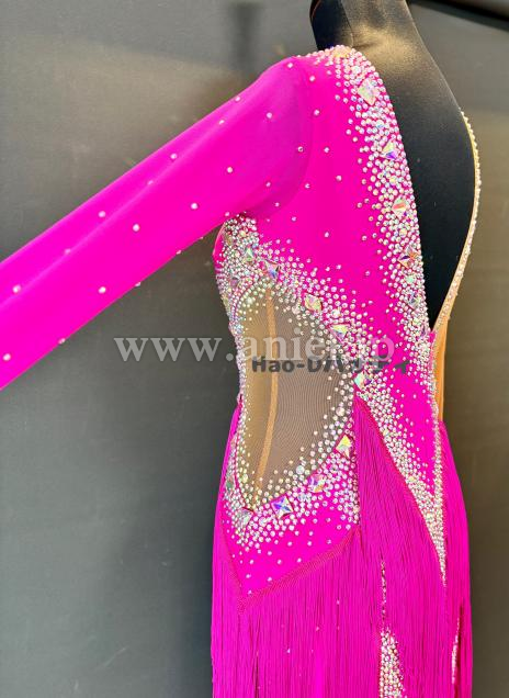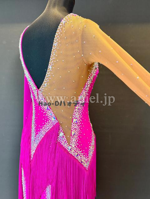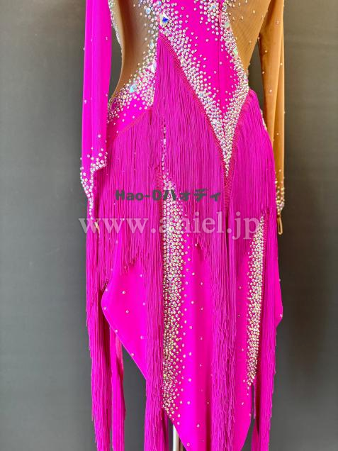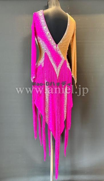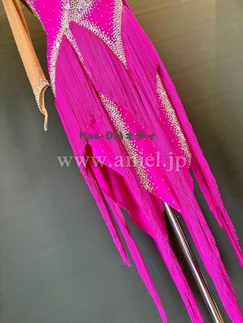 ウエストから裾に、シャープなVラインでつないたフリンジは、気になるお腹をおしゃれにカバー