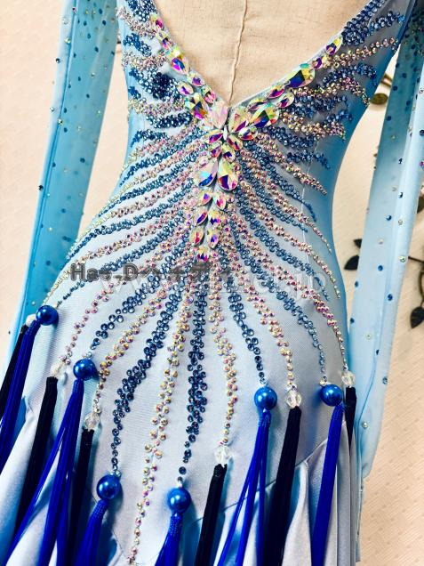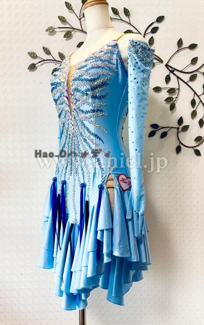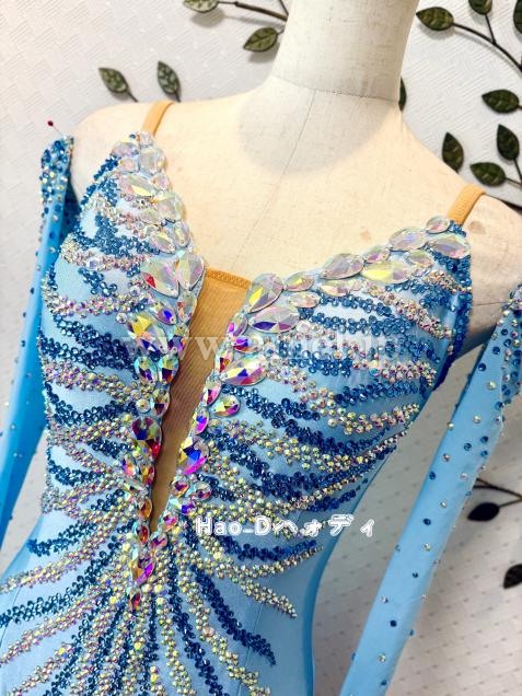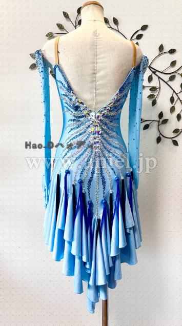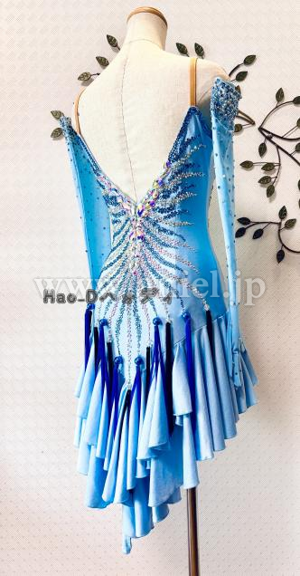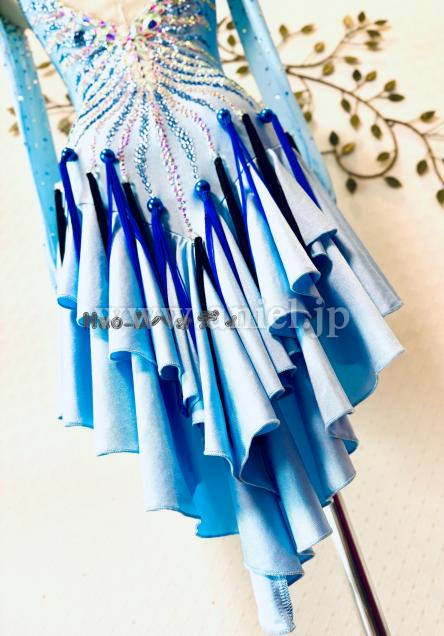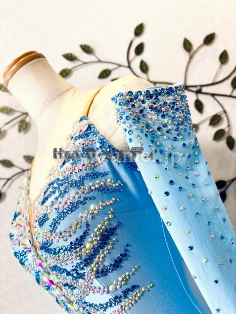透明感のあるアイスブルーカラーに流線形を大小ストーンで描き、暗めの会場では必ず目立つ豪華なドレス