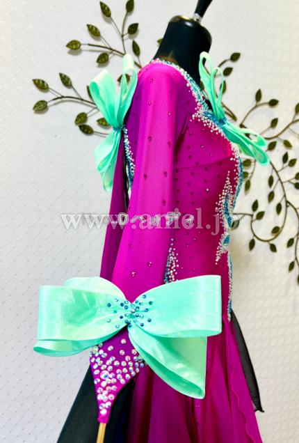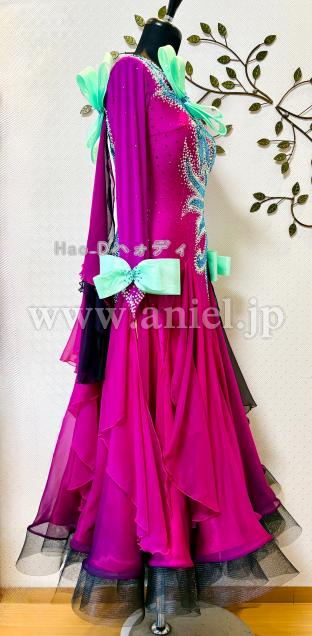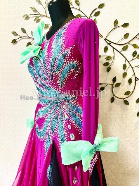 深みのあるマゼンタピンクがメーンになるベースに、明るいピーコックカラーのストーンを詰め込んだモチーフを、ウエストから流れるように散らし、女性らしくシャープに見せてくれる