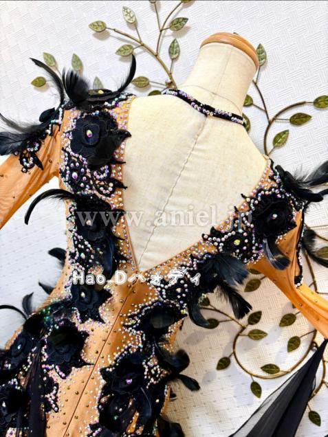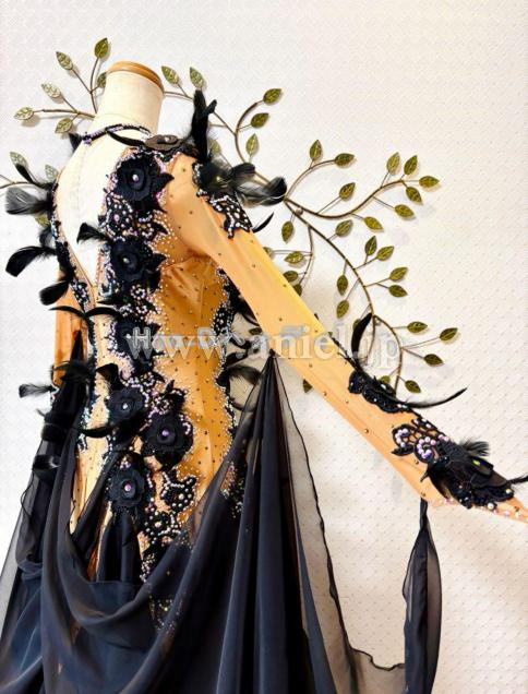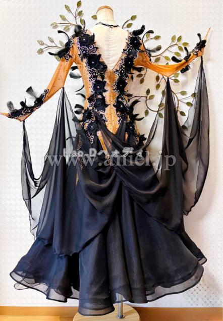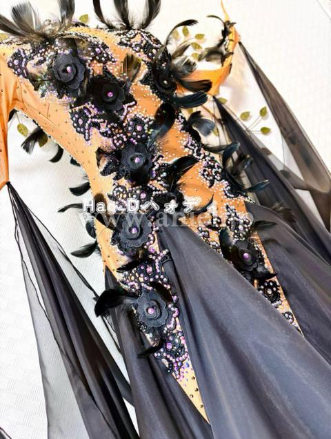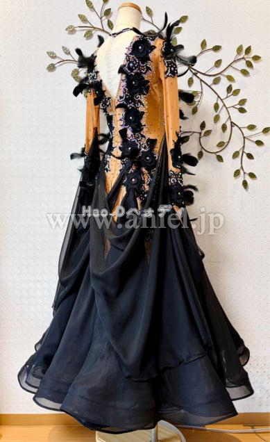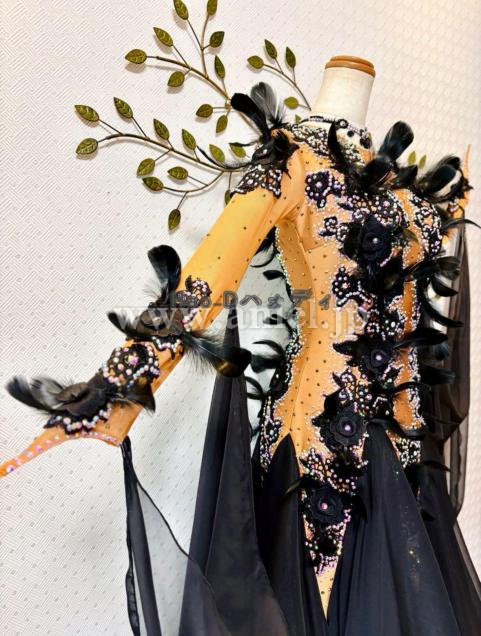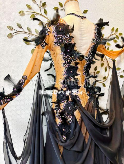 タンカラーの身頃に大柄のブラック刺繍モチーフと羽を装飾し、立体感あって華やか