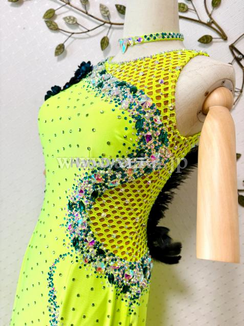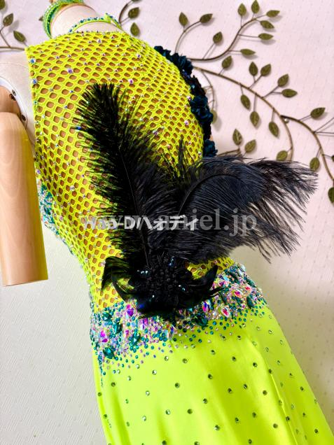 明るいショッキングカラーに、黒&モスグリーンの立体フラワー&ファーを装飾したタイトなロングドレス