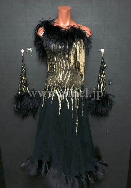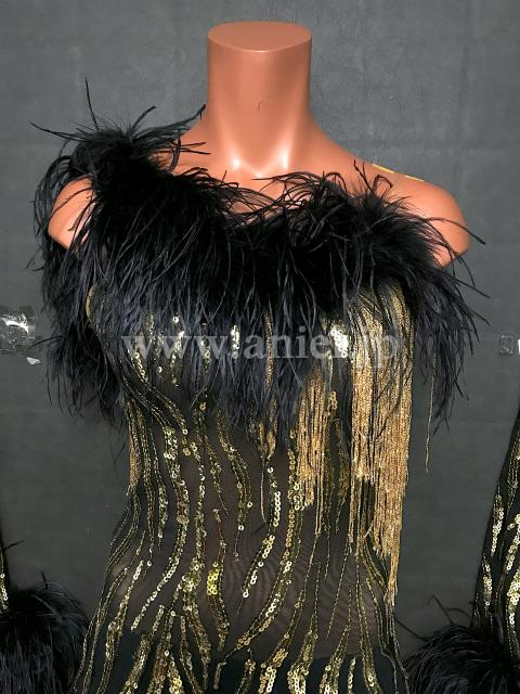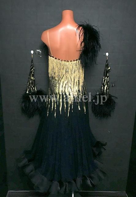 黒にゴールドのスパンコールとフリンジが装飾されたドレス