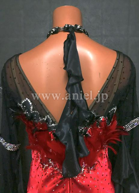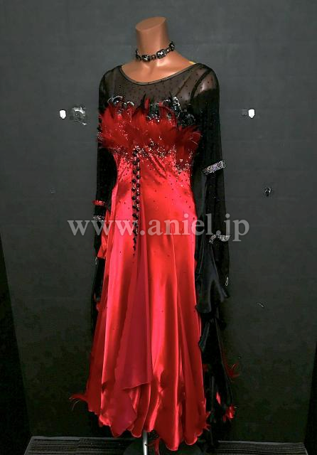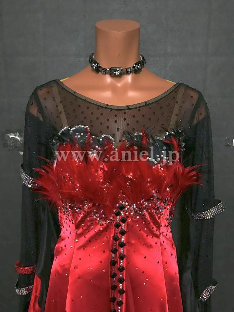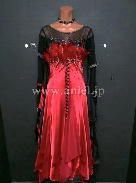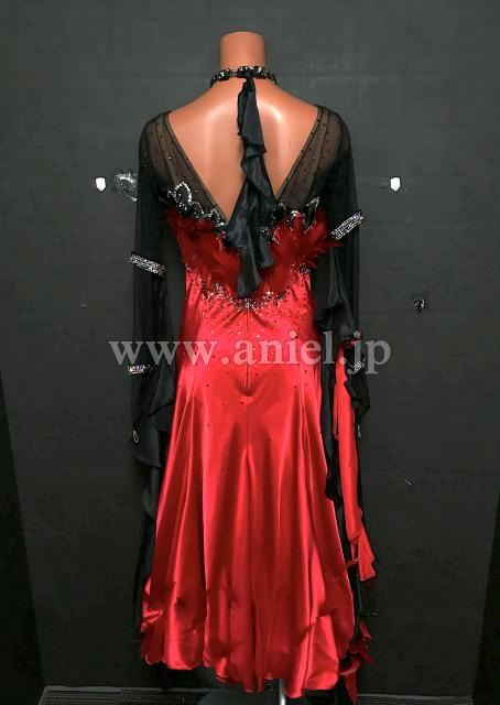 赤のサテンボディに黒メッシュの上半身がシックなデザインのドレスです。