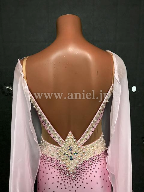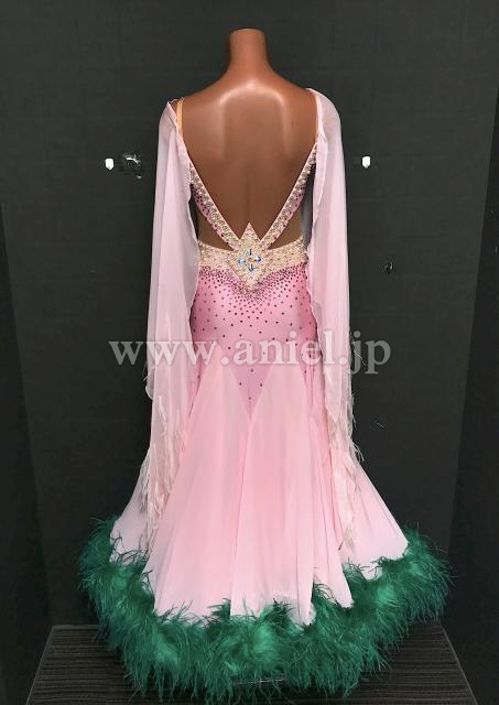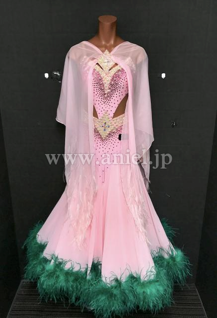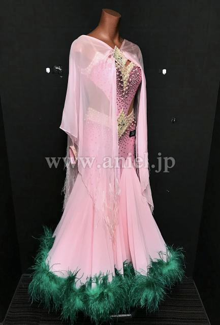 淡いピンクに緑のファーがコントラストで目立つドレスです。