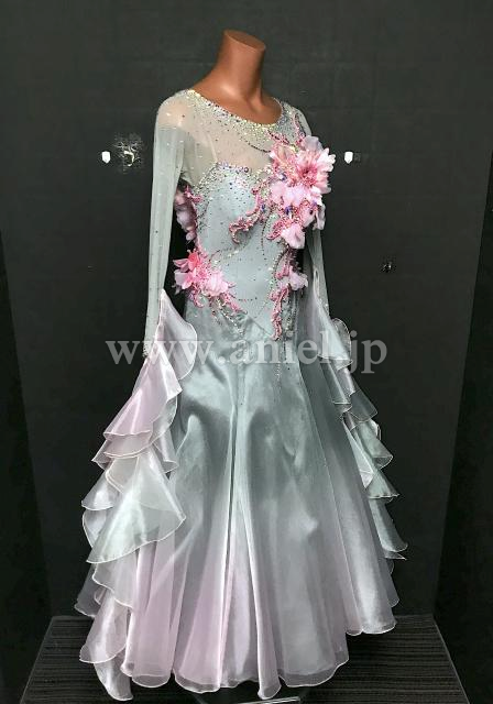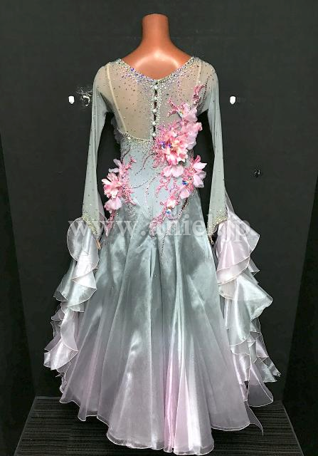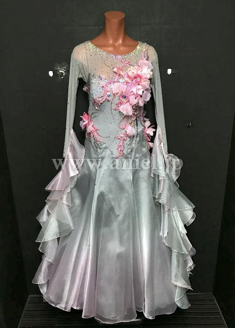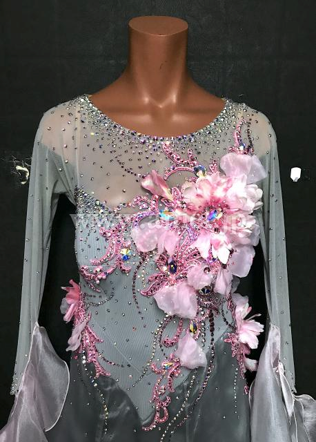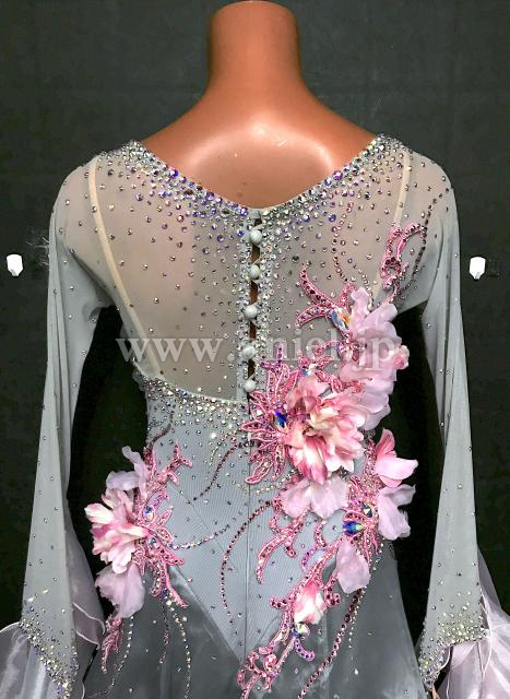 グレーのボディにピンクのお花やモチーフレースの装飾が可愛らしいドレスです。