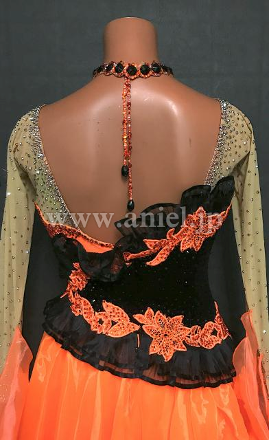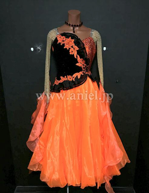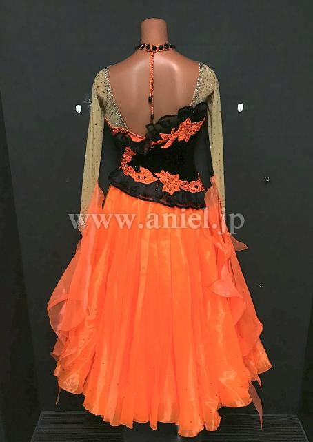 オレンジと黒のはっきりとしたコントラストが目立つドレス。