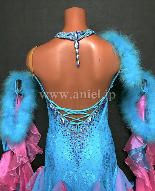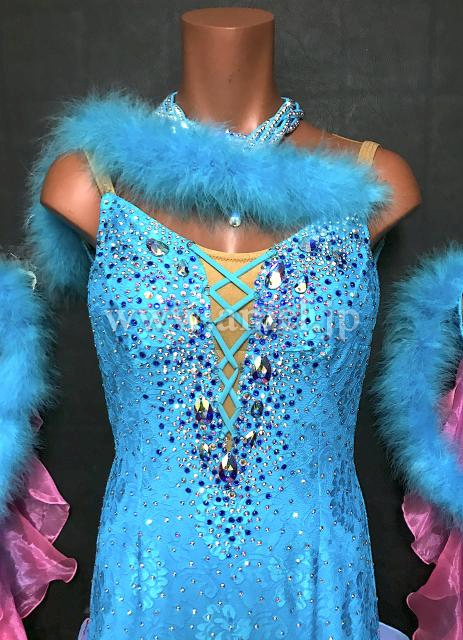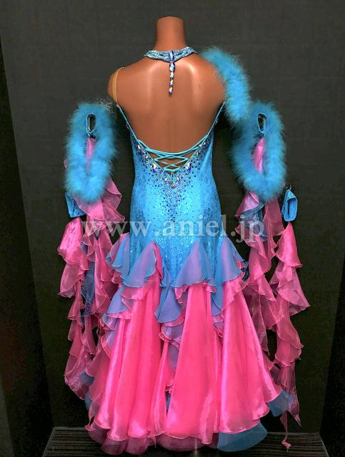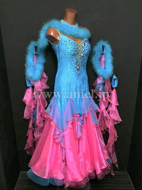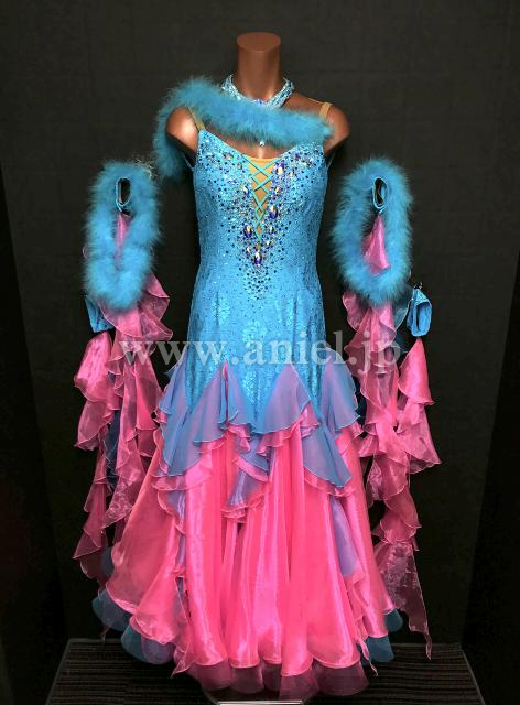 鮮やかな水色とピンクのコントラストが目立つドレスです。
