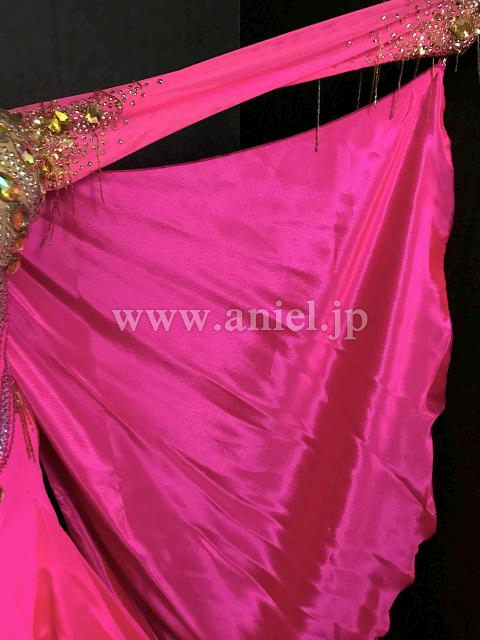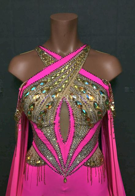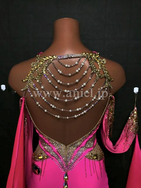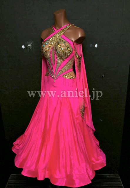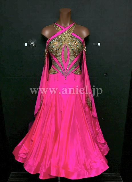 鮮やかなピンクにゴールドの装飾が華やかなドレスです。