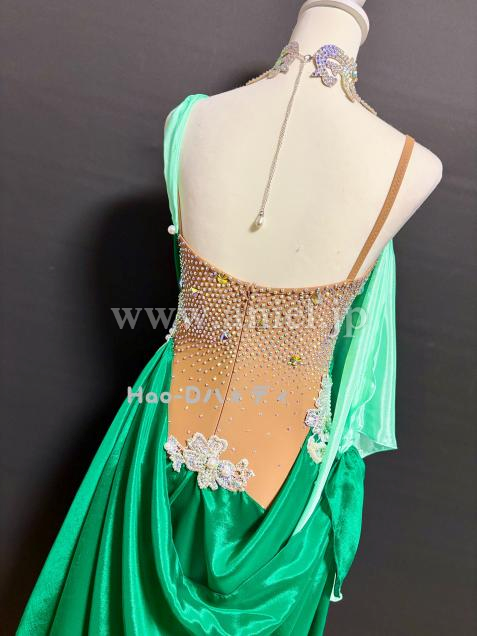 絞られたハイウエストから広がるスカートや、動きに合わせて流れるような背中のドレープが、動きを優雅に引き立てる