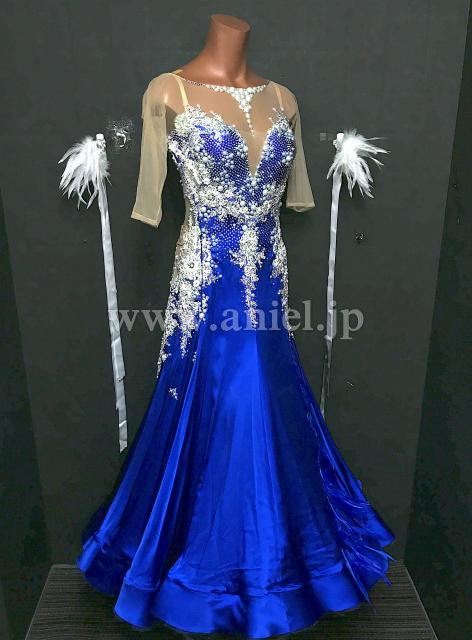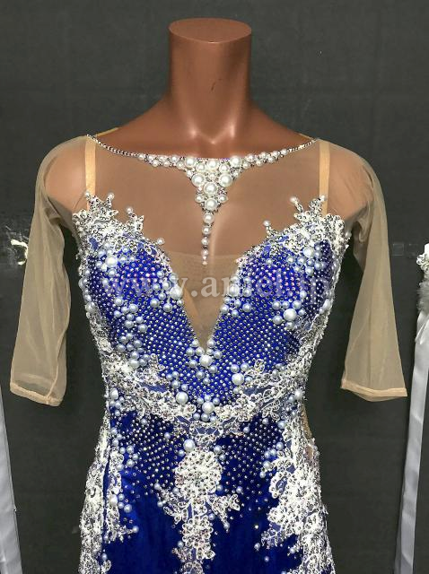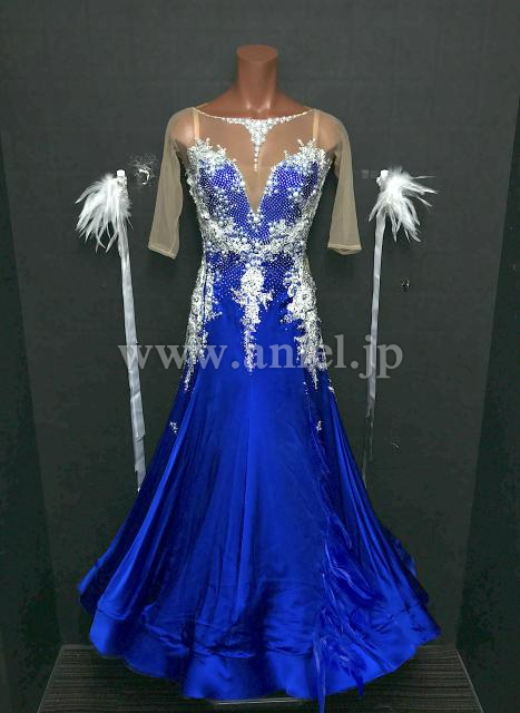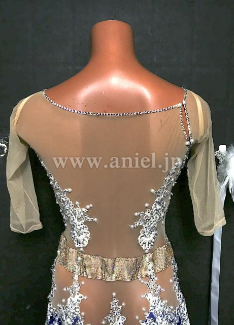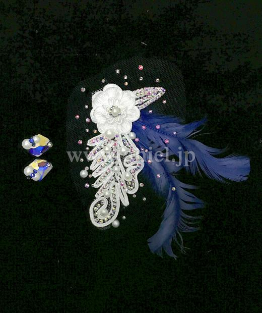 美しいブルーに白のモチーフレース、パールの装飾が映えて綺麗です。