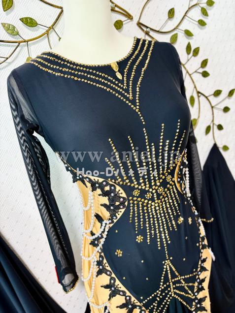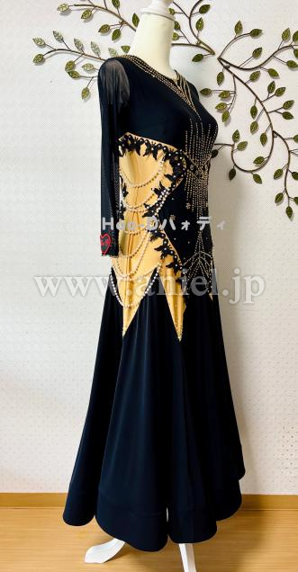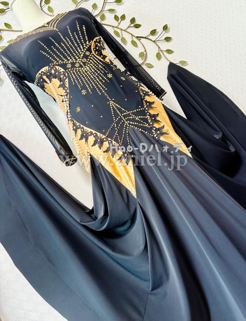 深みのあるブラックと柔らかなベージュの切替が美しいロングドレス