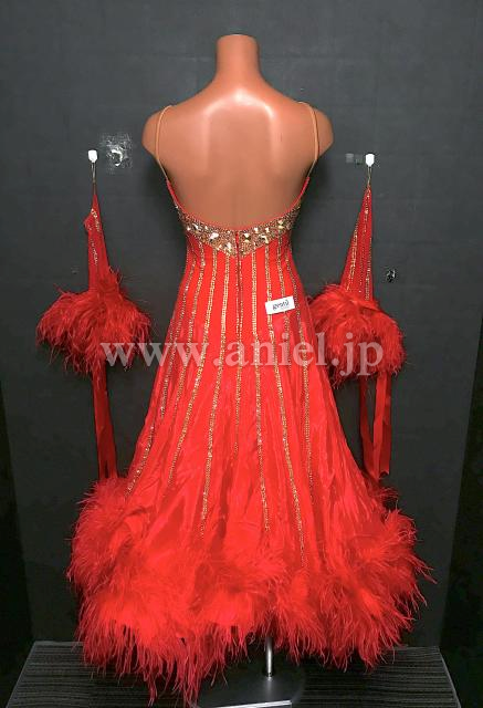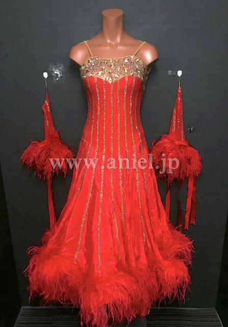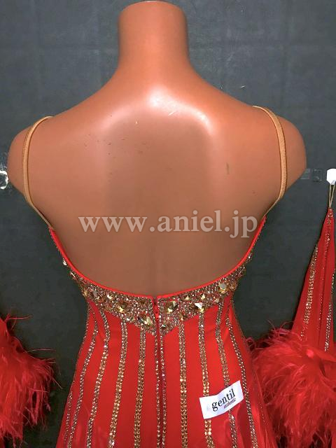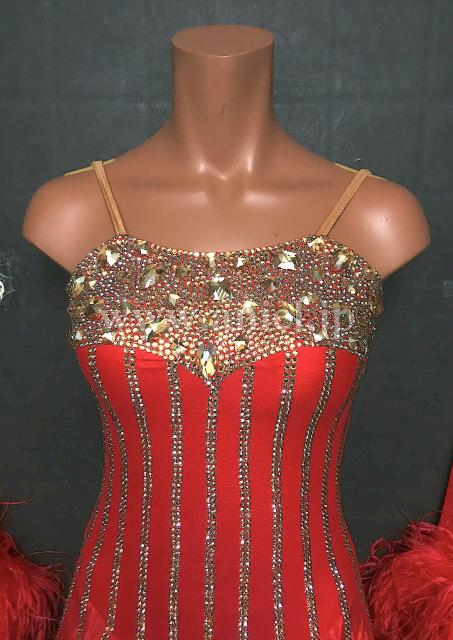 鮮やかな赤に美しいゴールドストーンのラインがキラキラと輝くドレスです。