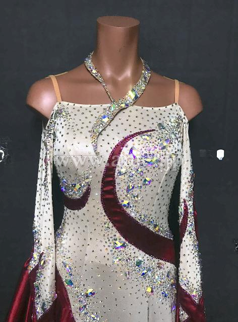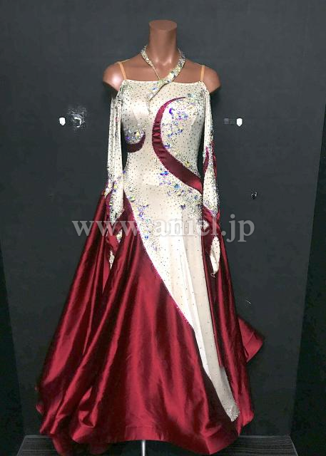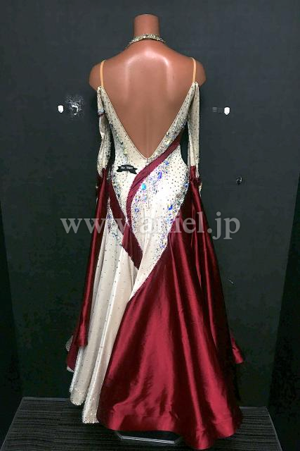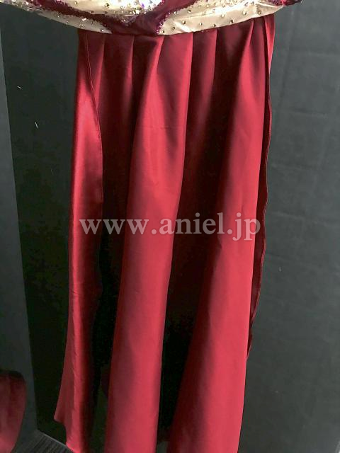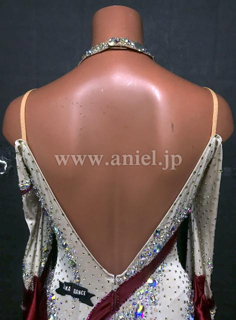 ベージュにワインカラーのバイカラーがシックなデザインのドレスです。
