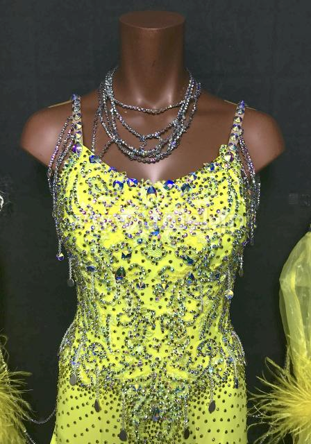 オーロラストーンのチェーンがキラキラと揺れて光り、ボディのレースモチーフにもストーンがたっぷり。ビーズストーンのフリンジが動きます。