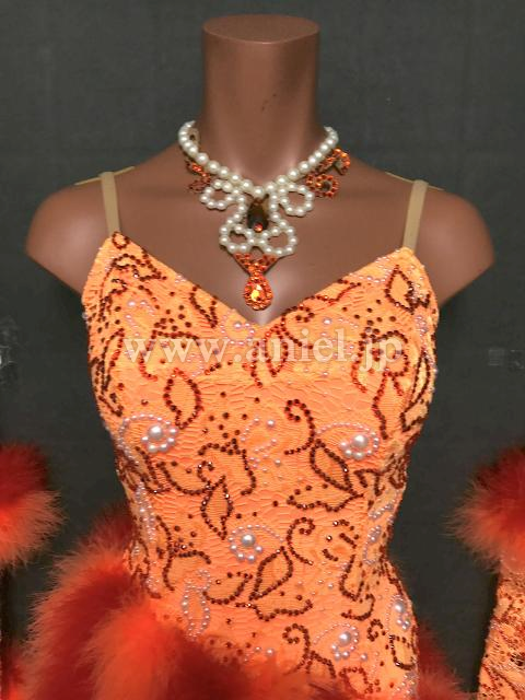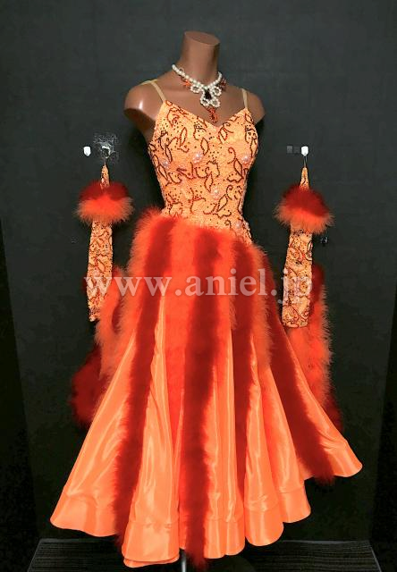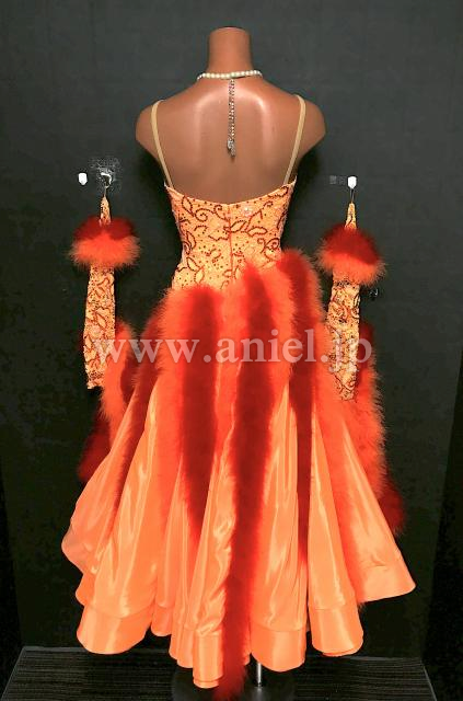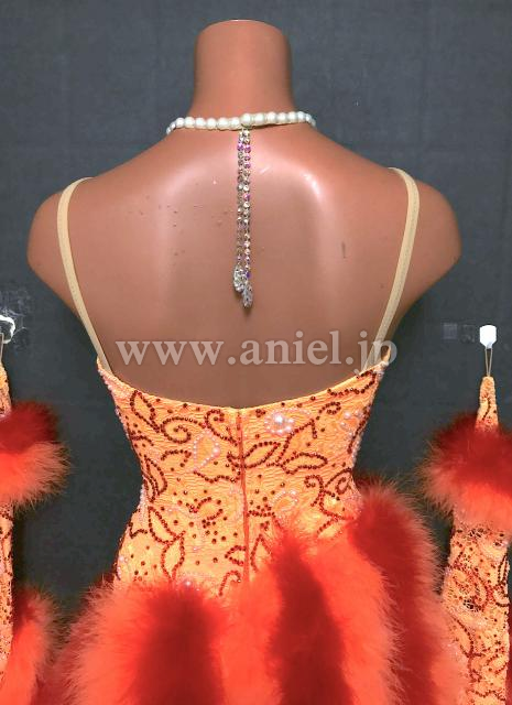 オレンジ、赤のマラボーがスカートにラインで施されているドレスです。