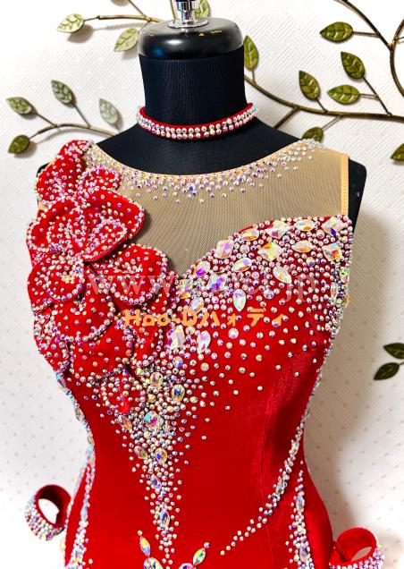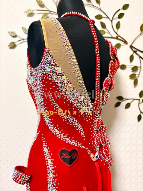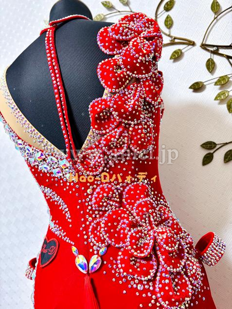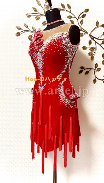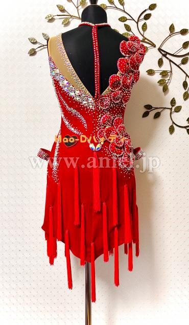 ベロア生地の重厚感、立体花モチーフのアート性、ラインストーンの輝き、フリンジの躍動感、異なる魅力を持ち合わせた素敵なドレス