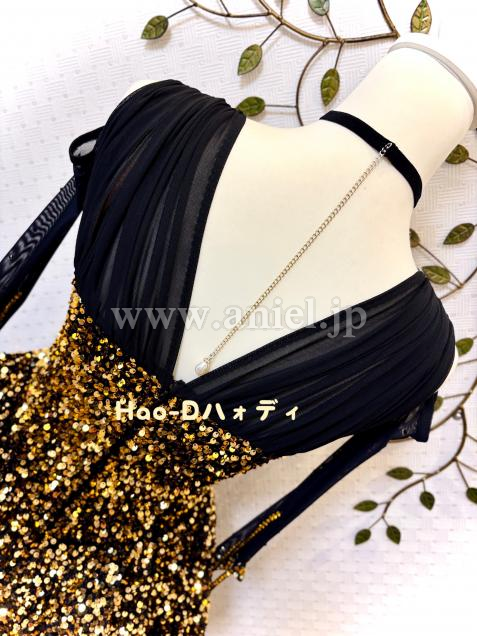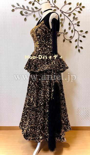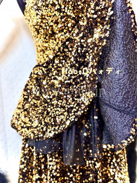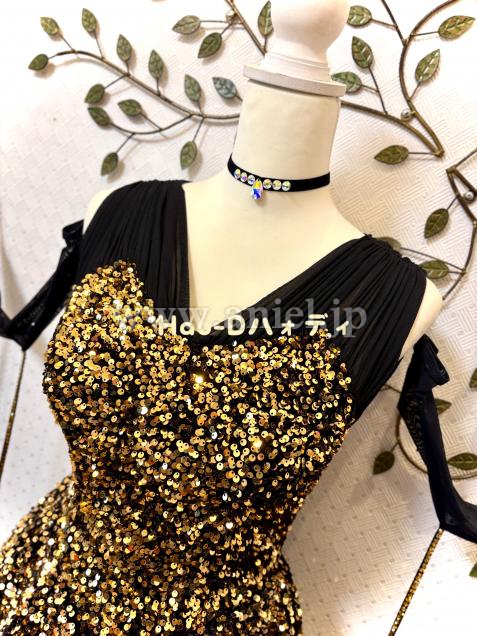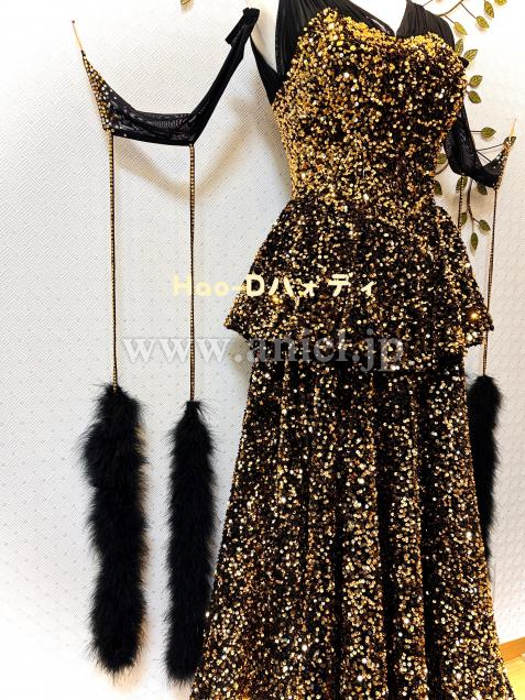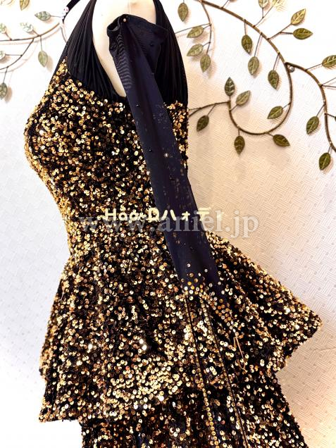 黒&ゴールドの強いコントラストと、スパンコールの輝きが主役のラグジュアリーなドレス