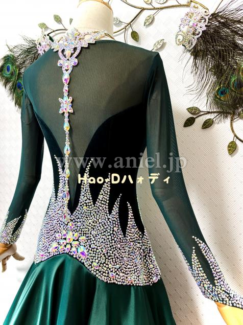 ぎっしり敷き詰められた豪華なストーン装飾に、ライトに反射して柔らかく輝くサテン生地の円形スカート、ステップに合わせてふんわりと広がり、フロアで存在感を放つ
