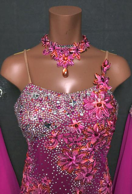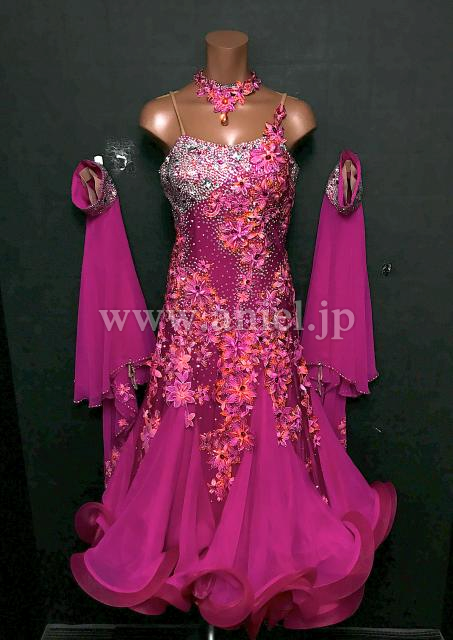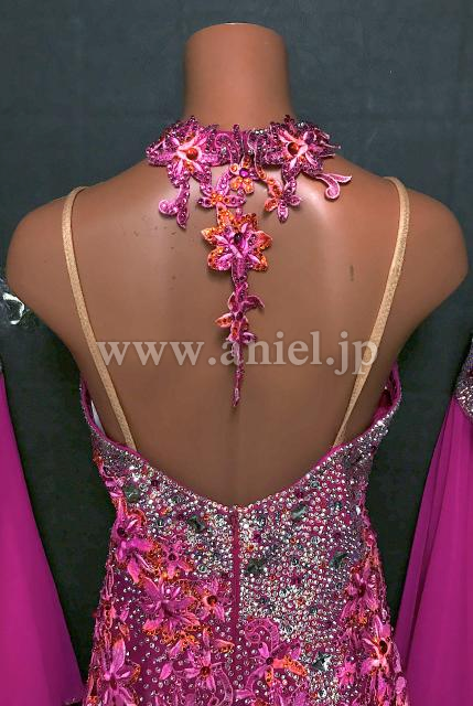 ピンクとオレンジの花モチーフが豪華にボディを装飾するドレスです。