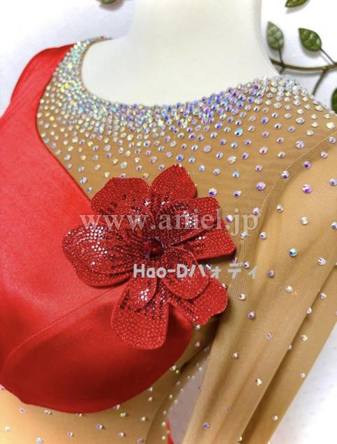 深い艶を放つレッド、視線を自然に誘導するS字切替、体の曲線を美しく見せ、しなやかな動きをより美しく引き立てる