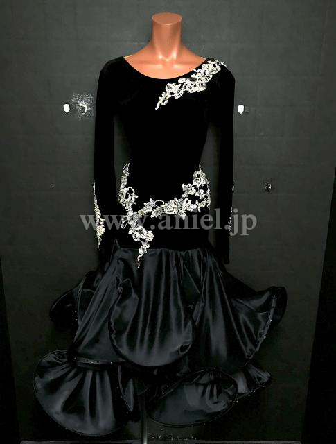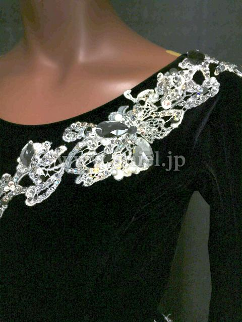 黒ベルベットのボディにモチーフレースの装飾が映えるドレスです。