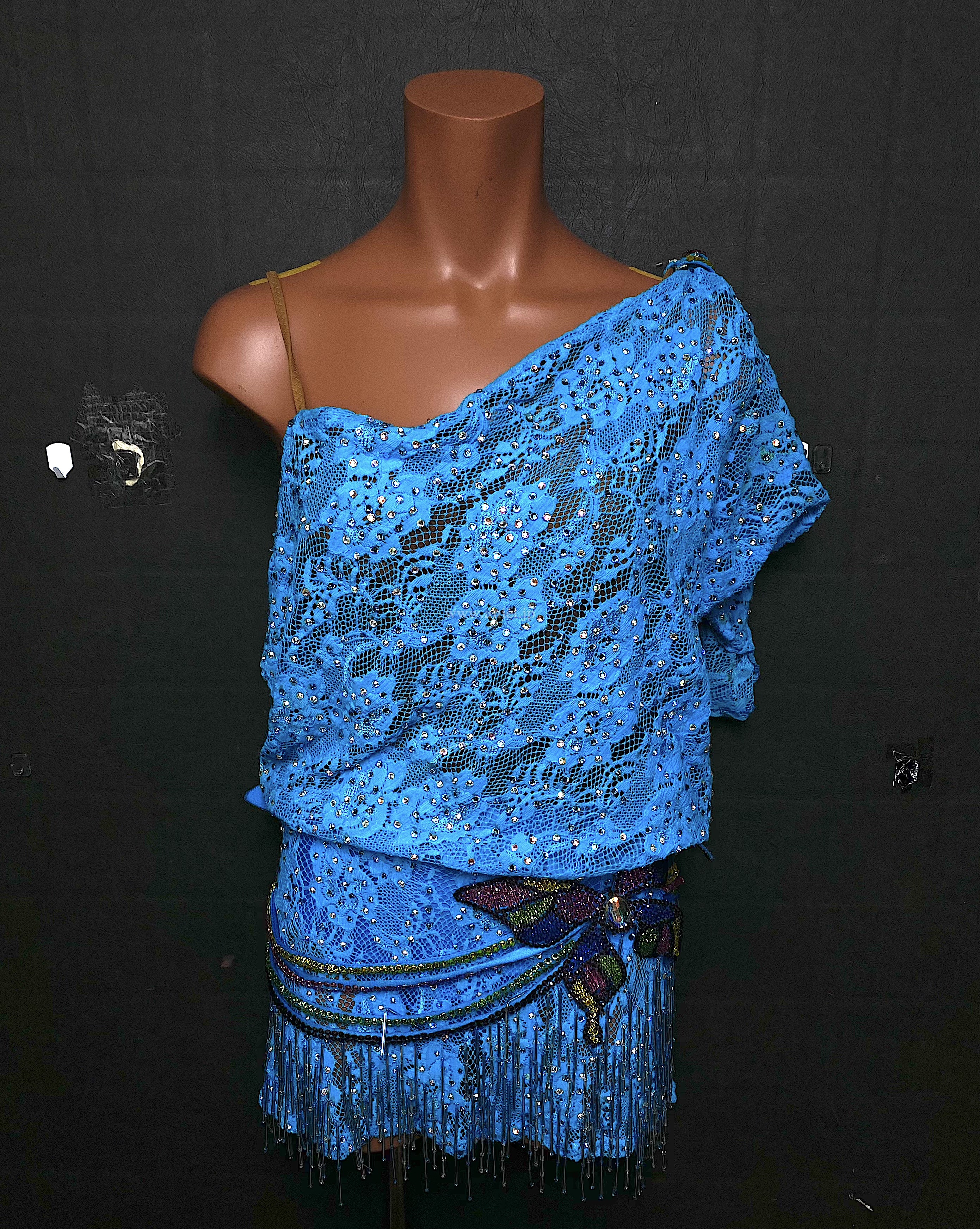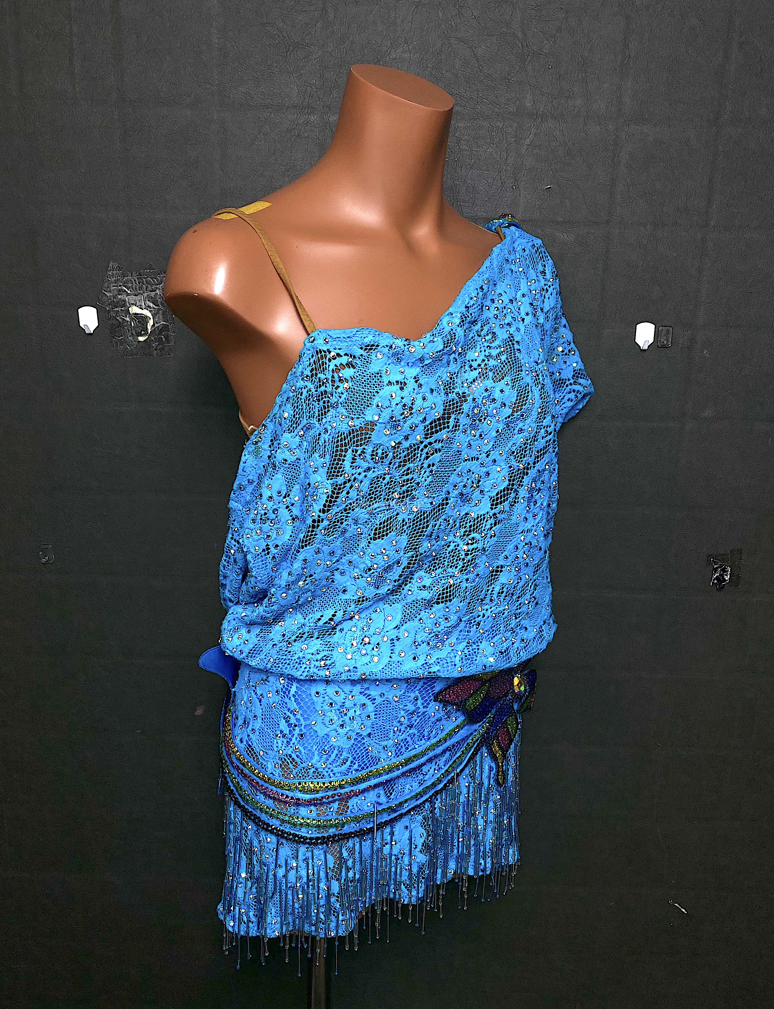 ミニ丈レース生地の袖のドレープが動きを出すドレスです。
