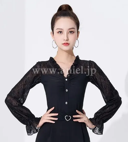 襟、袖のフリルが可愛らしいデザイン。
