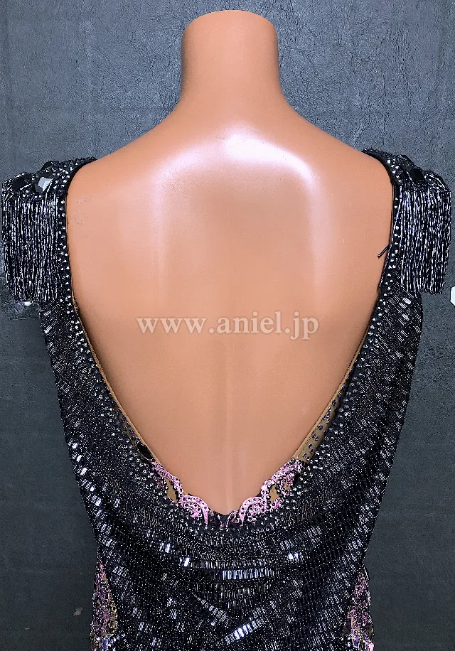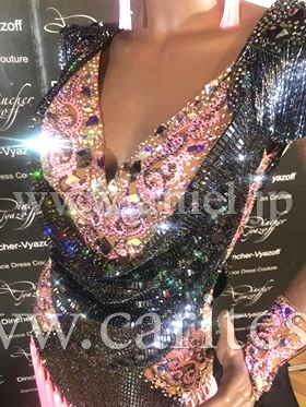 肩のビーズフリンジやスパンコール生地が煌びやかに踊るドレス。