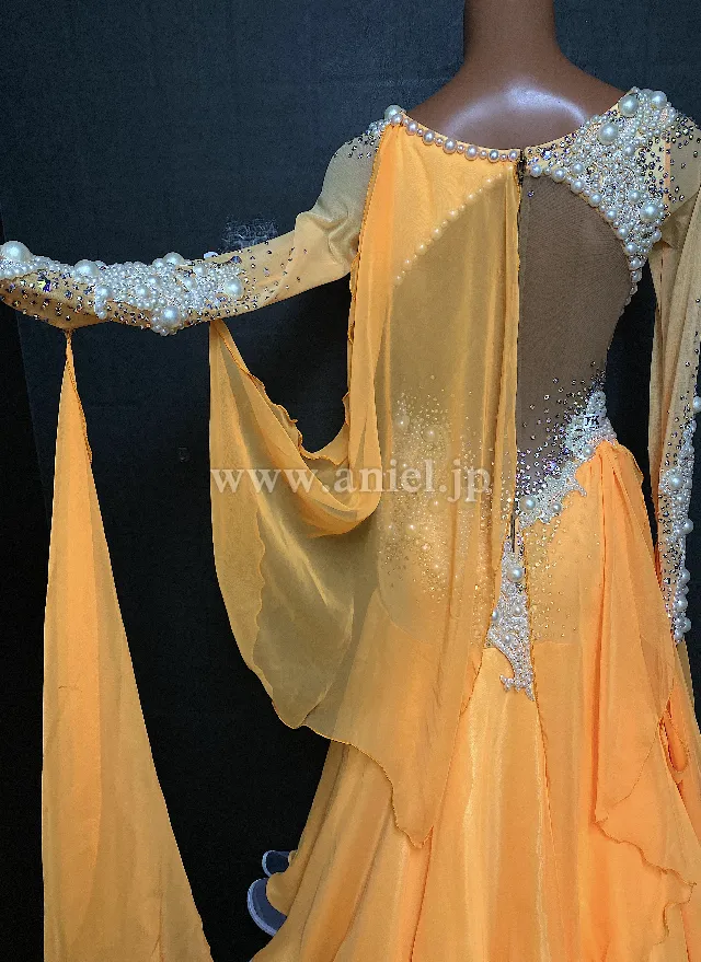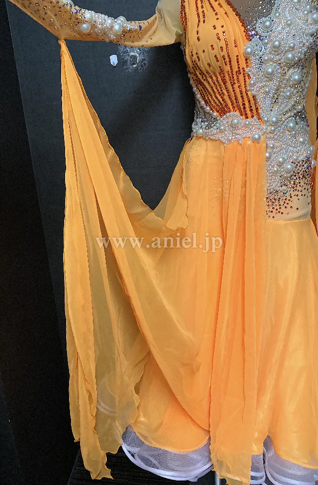 明るいオレンジカラーに大粒パール、ストーンの装飾が華やかで豪華なデザイン。