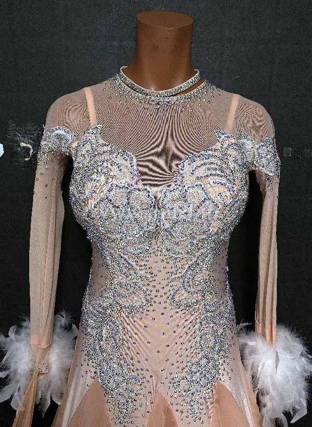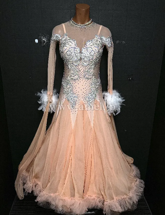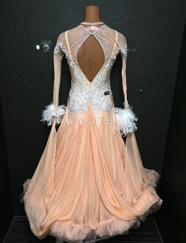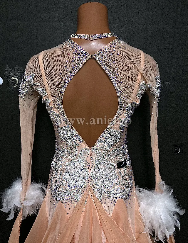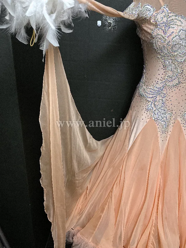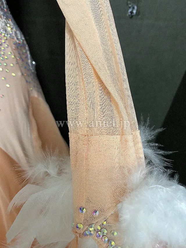購入時は裾に同色のフリルだけのシンプルなドレスだったので、ボディの白モチーフに合わせて白のフェザーを手首とスカートに後付けしました。