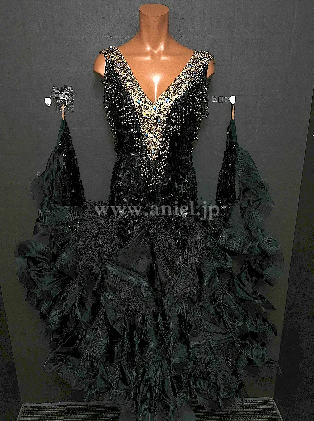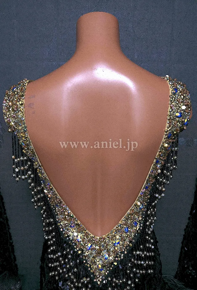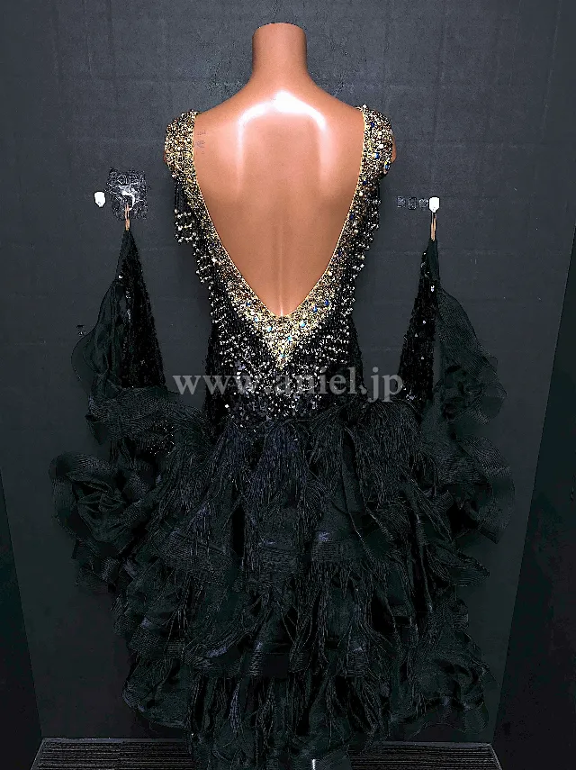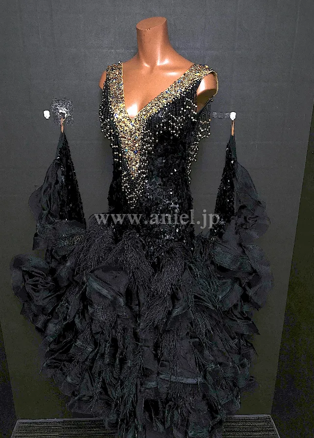 Elain Gornallからとてもユニークなデザインのドレス。ボディは黒のスパンコール生地。胸と背中の金色の部分もスパンコール+スワロフスキーでゴージャスに光ります。スカートはティアード+オーストリッチ。ビーズのフリンジが甘くなりがちなティアードドレスに大人のテイストを加えてくれます。
