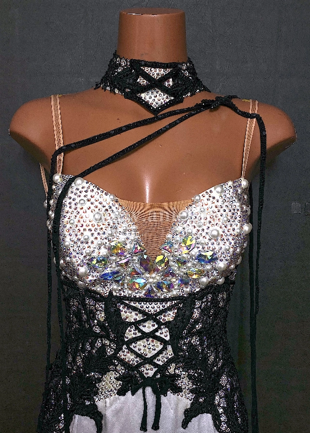 胸元はパールやストーンで装飾されています。