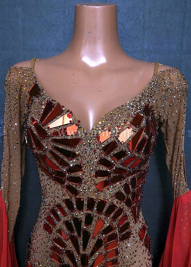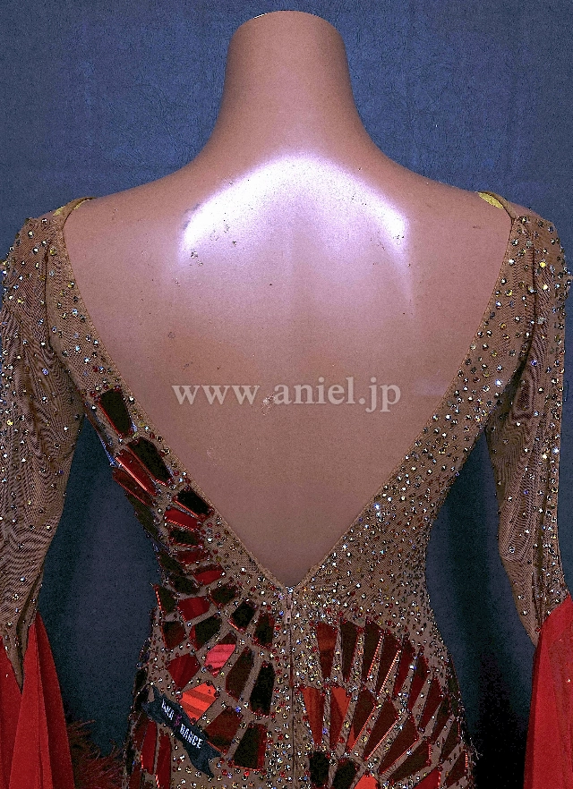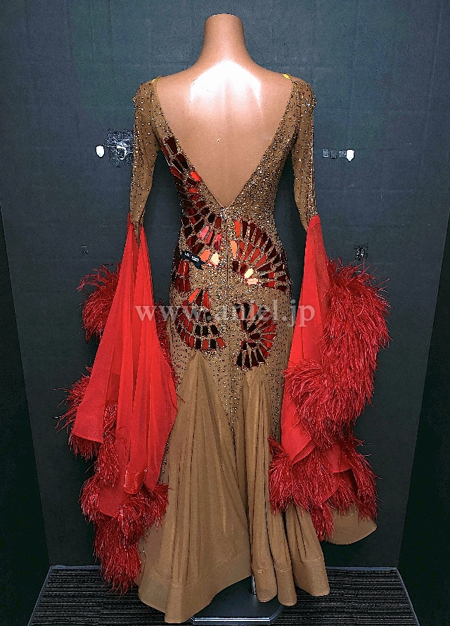 ベージュに赤のミラーの飾りがおしゃれでかっこいいドレスです。