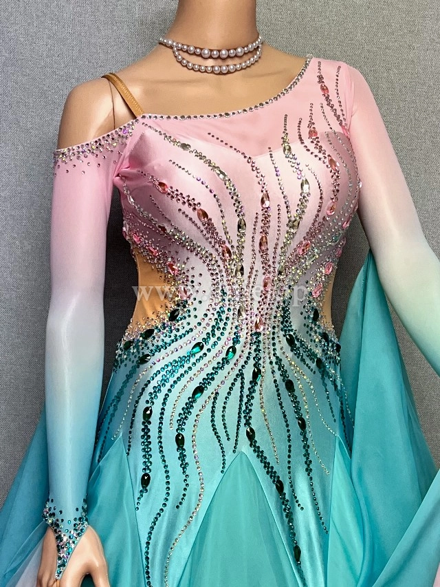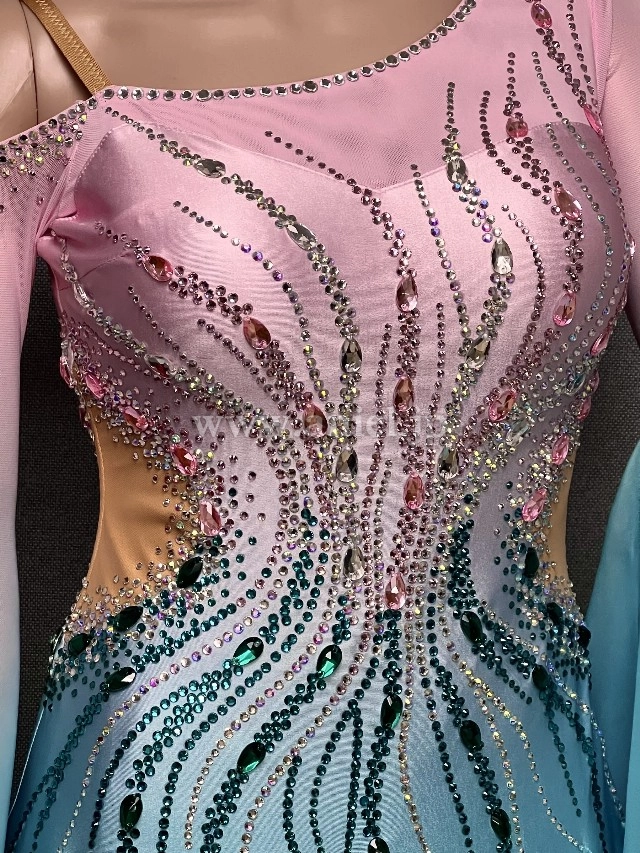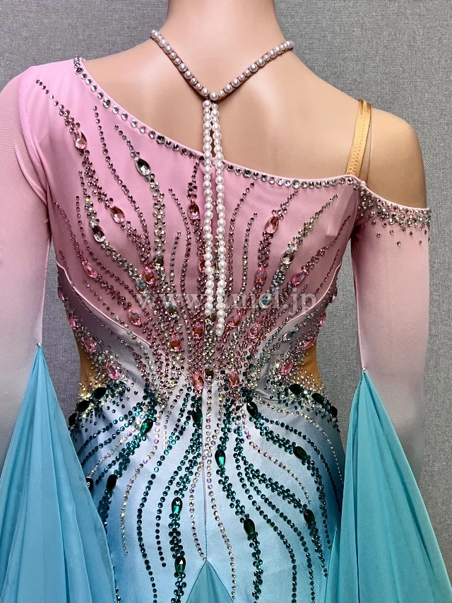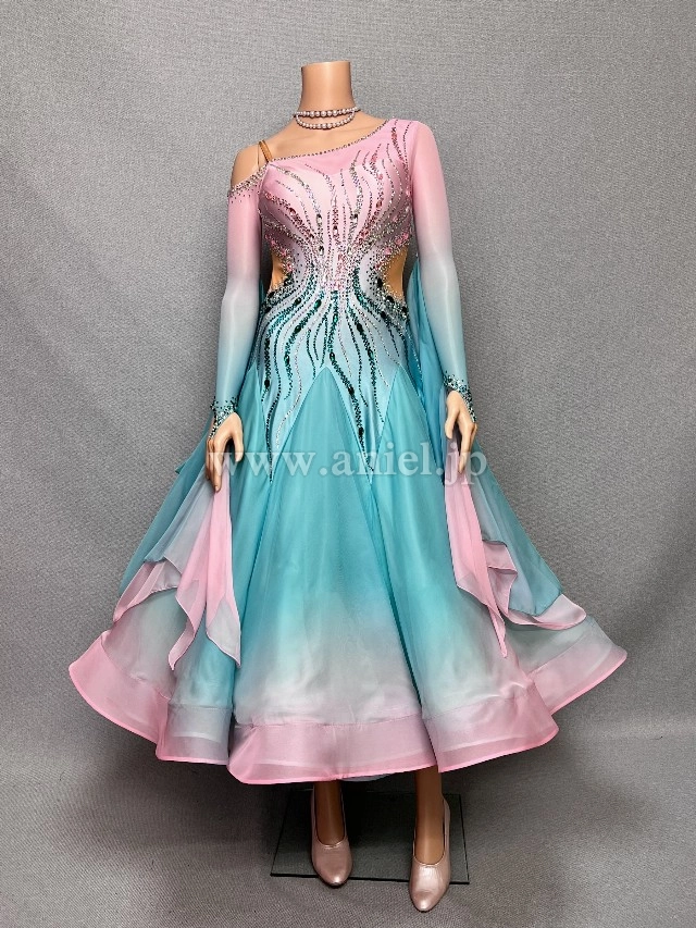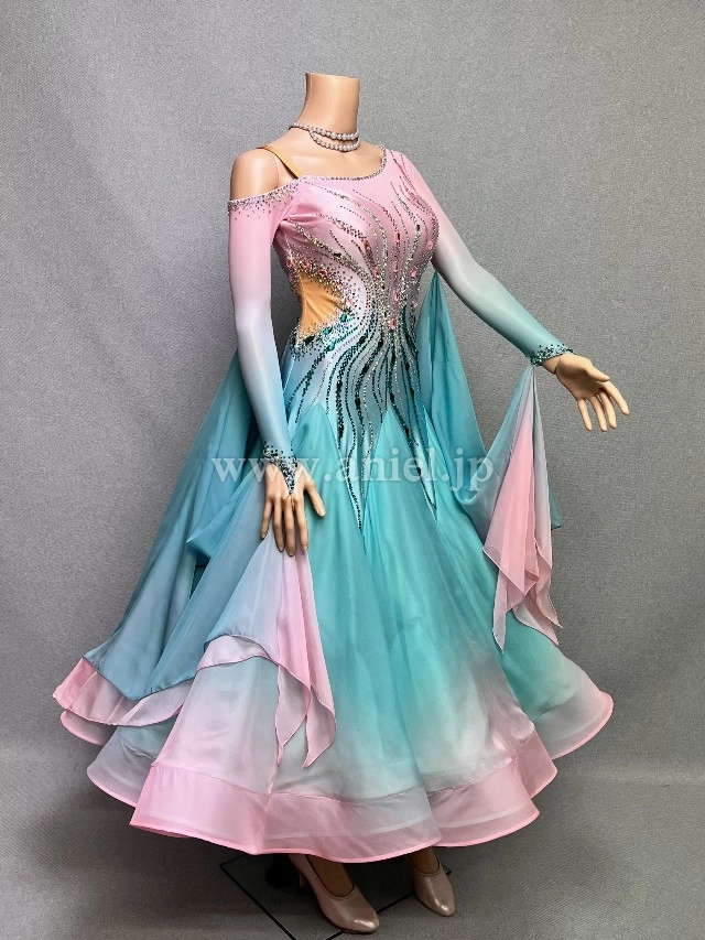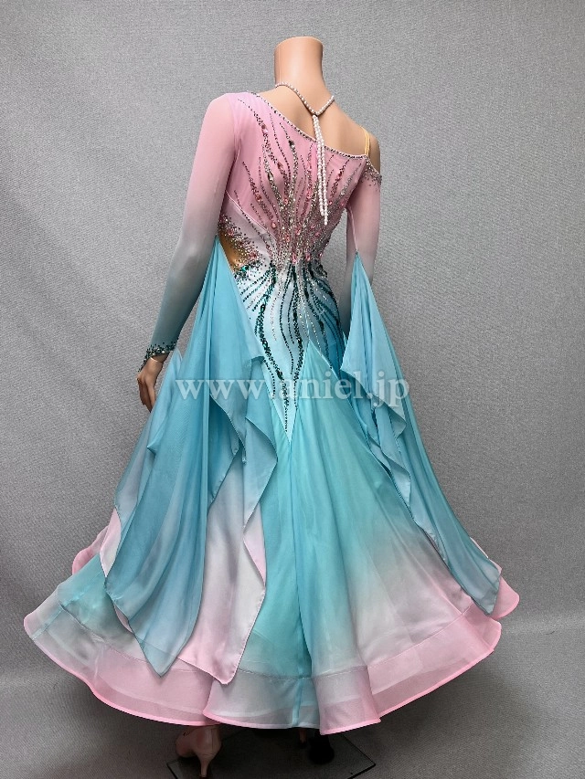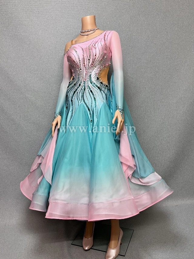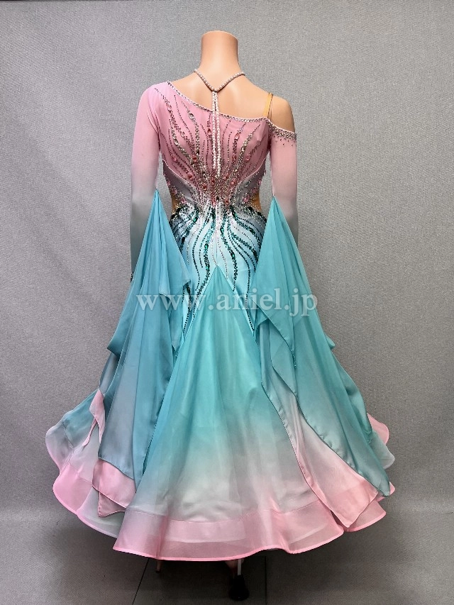 ピンクからグリーンへのグラデーションが爽やかなAラインドレス。