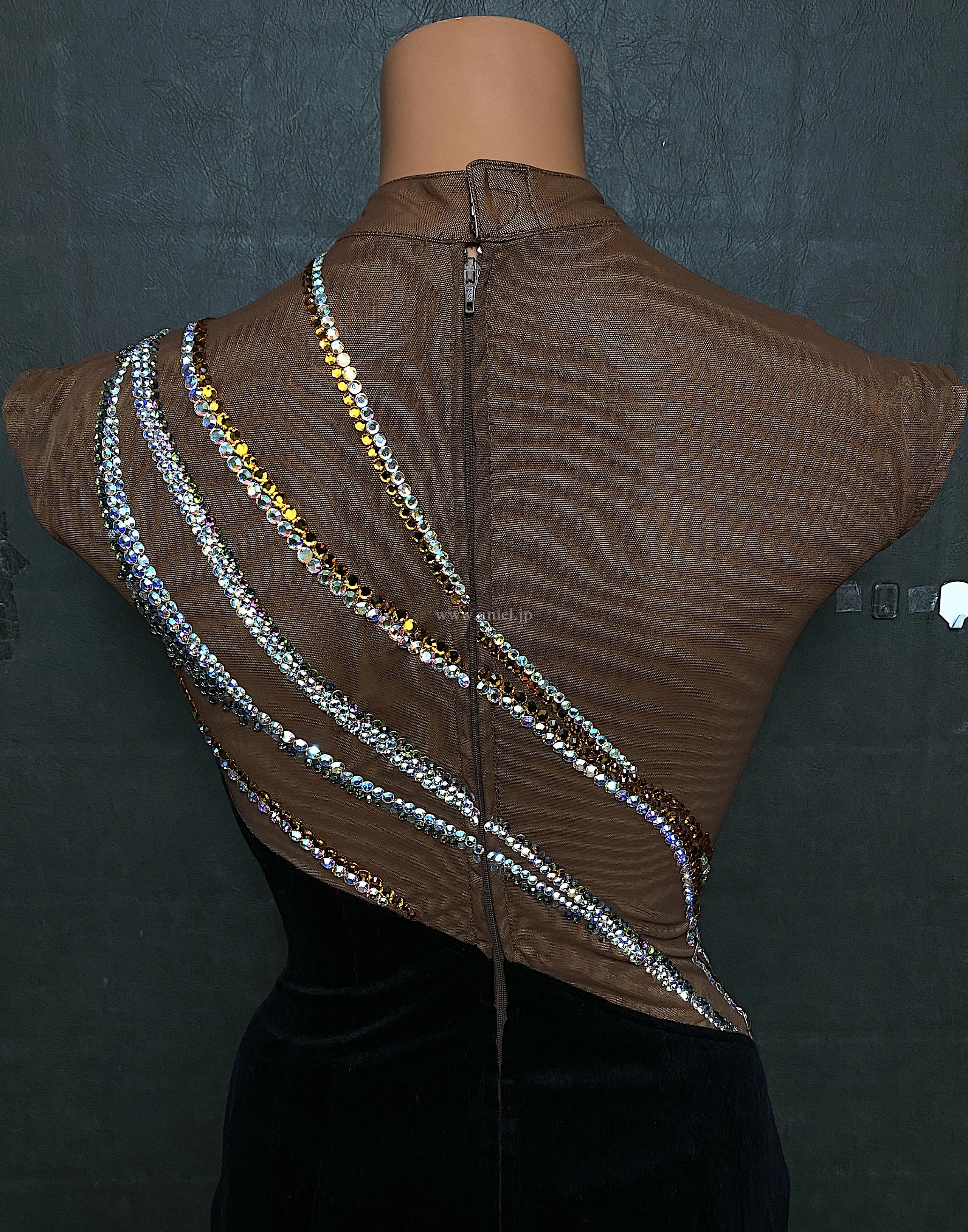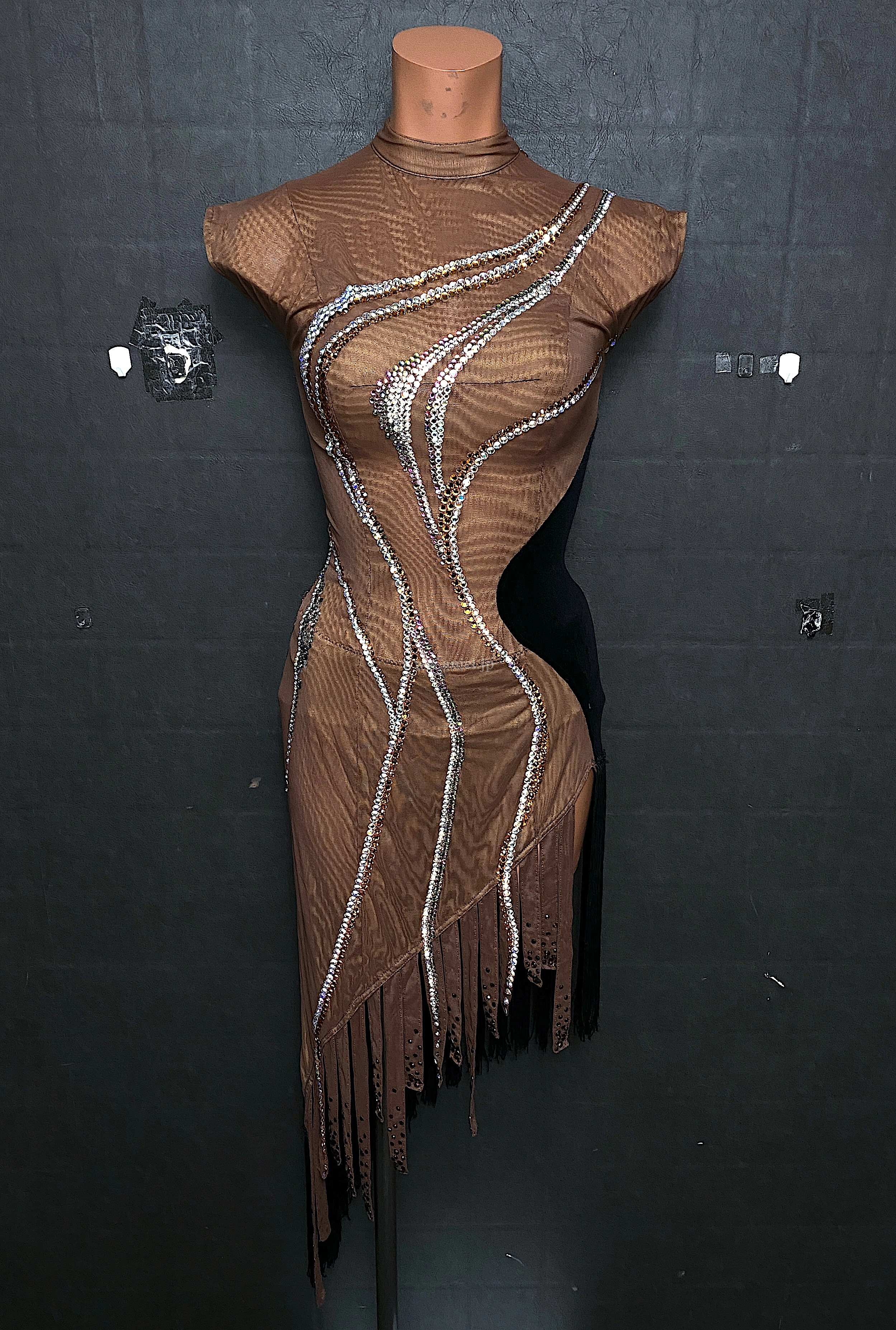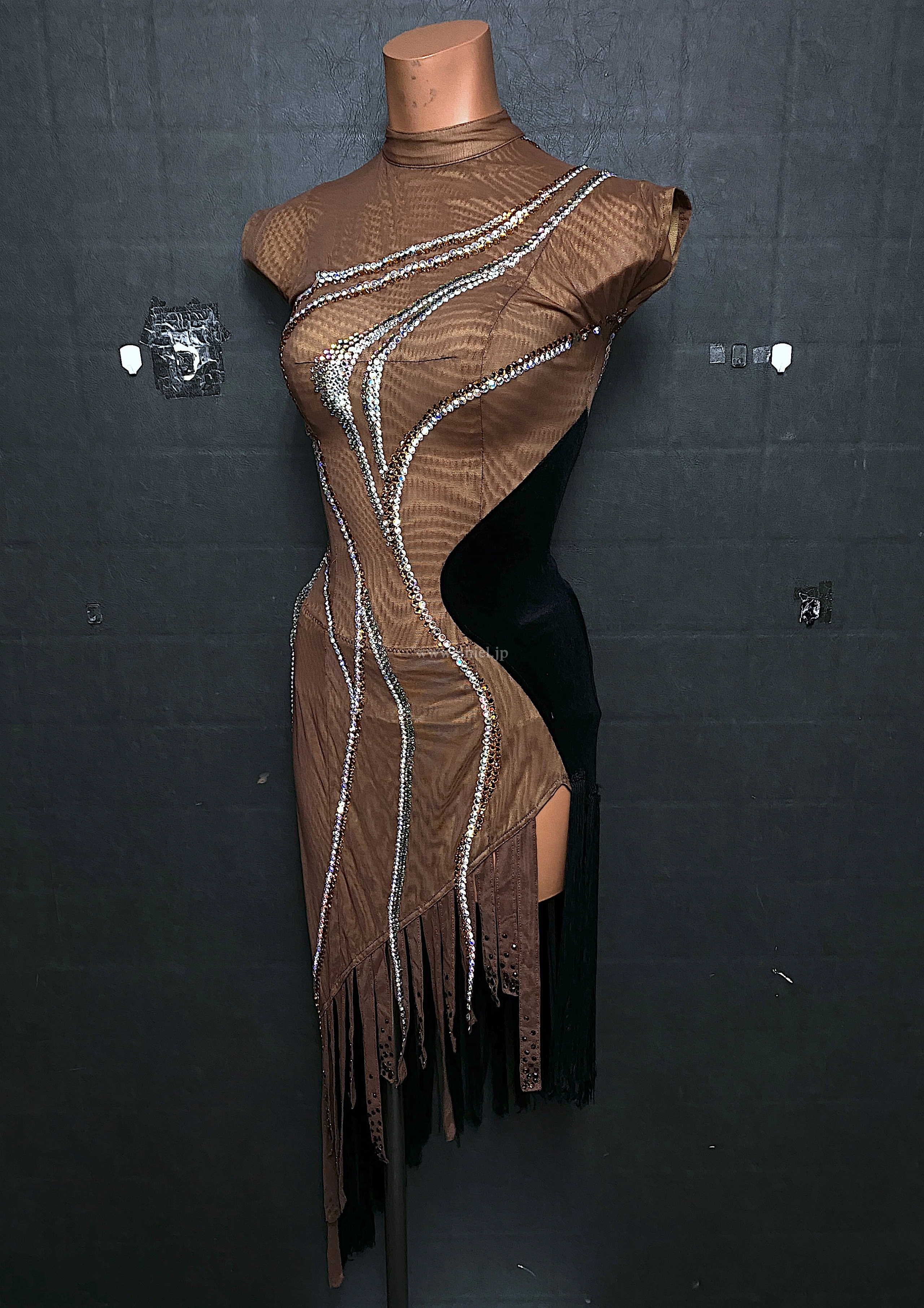 茶と黒のアシンメトリーデザインのドレス