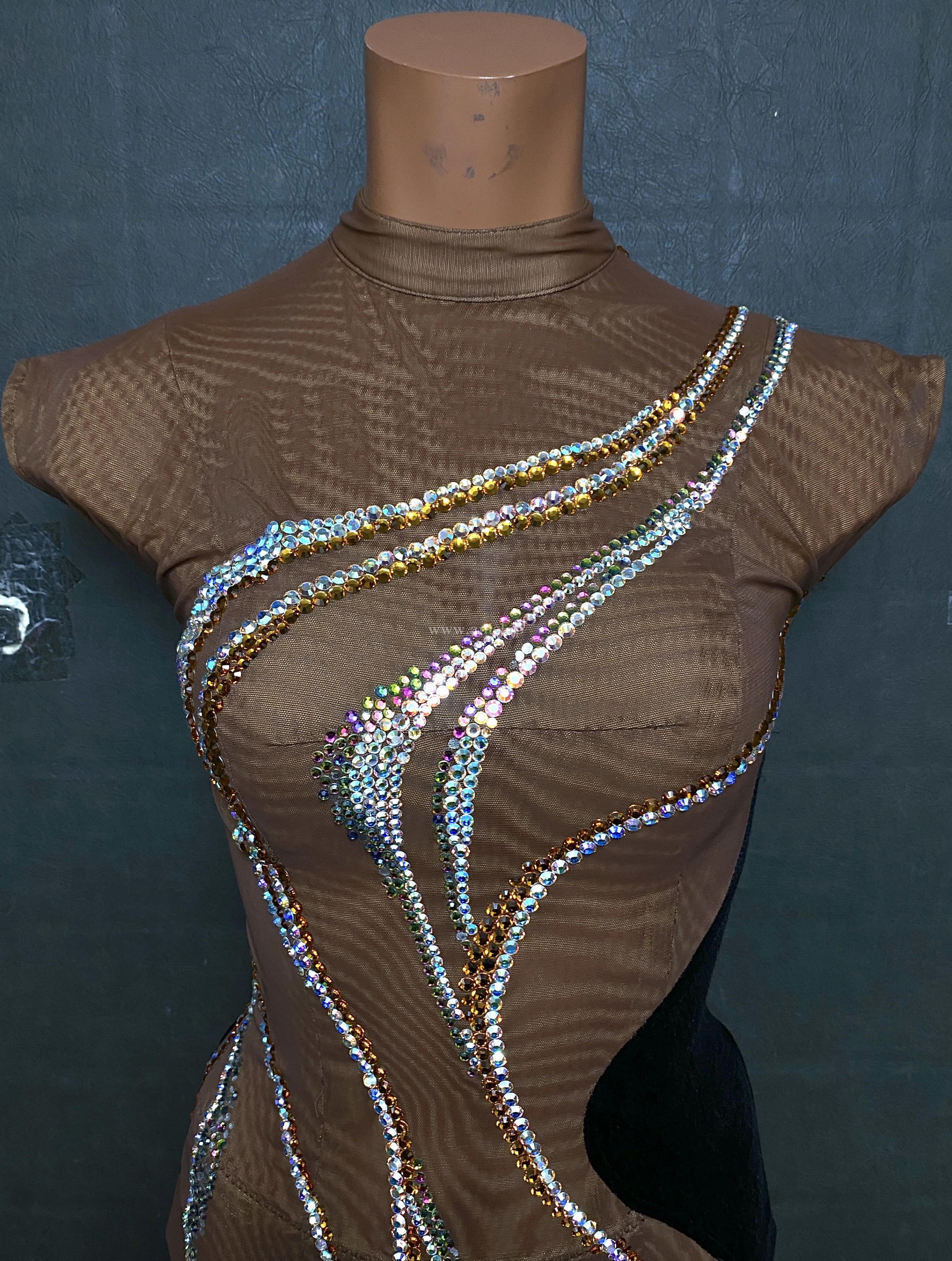 ストーンの装飾と生地の切り替えのデザインがスタイルを綺麗に見せてくれます