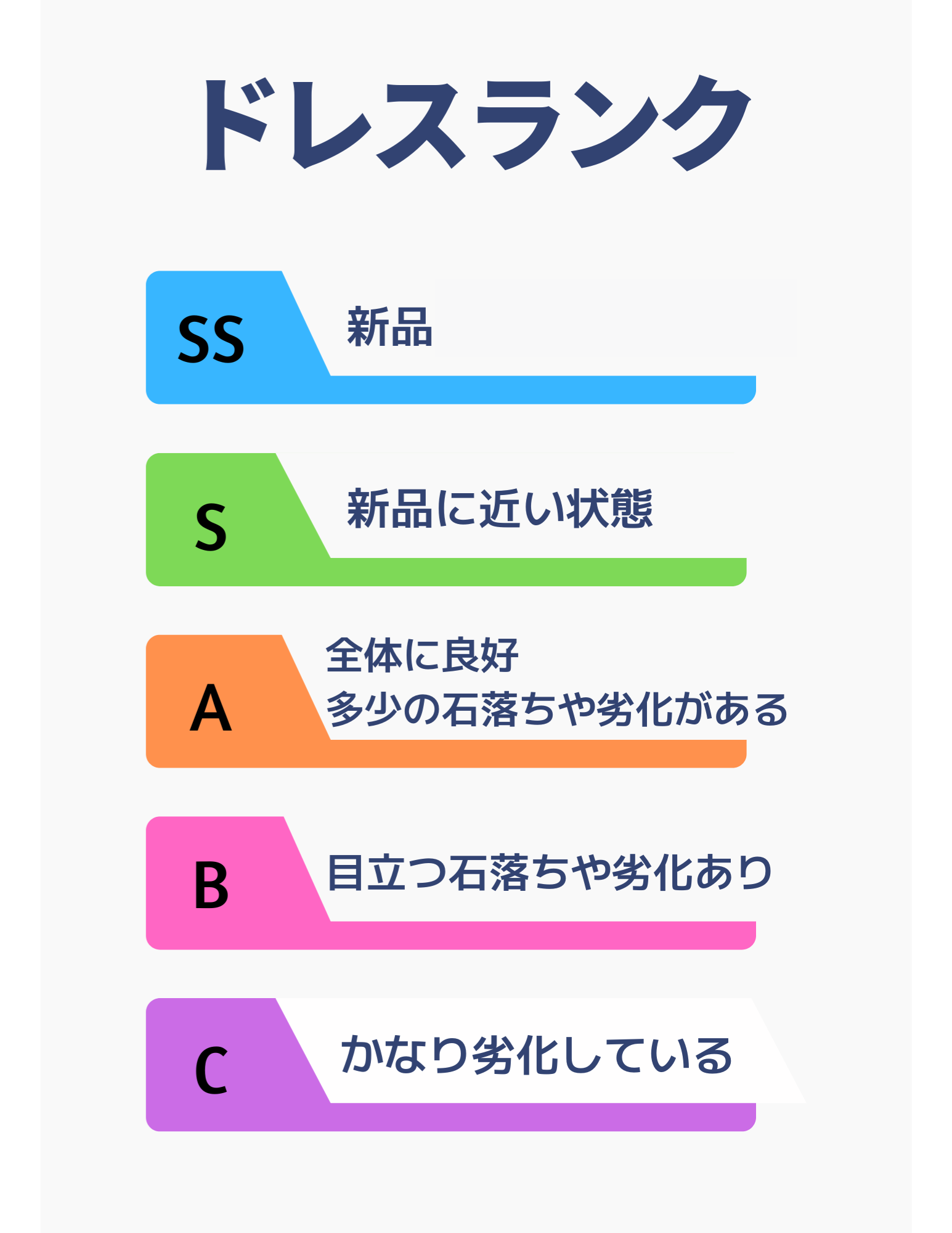 修復不可能な破れ、変色、広範囲の石取れがあるなど非常に状態の悪いドレス、古すぎるドレスは掲載ができません。状態によってはストーンメンテナンスや事前のクリーニング(実費)が必須になる場合がございます。掲載できないと判断させていただいたドレスについては返送となります。状態が不安な方は事前にご相談ください。製作より3年以上経ちますと価格がつかない場合も多いので着る機会がなくなったドレスはなるべくお早めに出品されることをお勧めいたします。